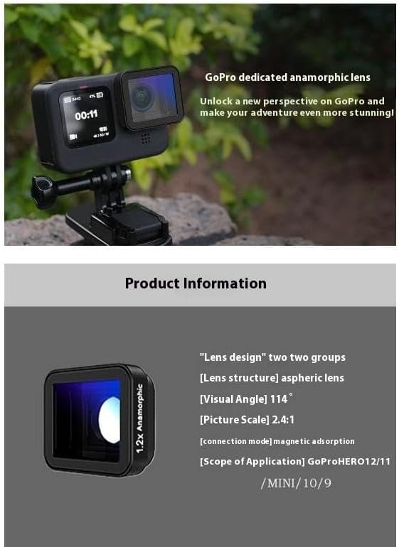 1. Applicable models: Gopro Hero 13 12 11 11/11 MINI 10 9 Black 2.The anamorphic lens is made of optical glass with a high-definition, double-sided, multi-layer broadband coating that delivers high-definition, transparent cinematic quality and minimizes reflections, lens flare, and other artifacts for ultimate clarity. It offers a wider field of view for framing more scenes 3.This anamorphic lens captures a fantastic blue flare effect in bright light. It brings a vintage cinematic effect to your camera, achieving a brighter, sci-fi vignette effect that works great when shooting lights. 4.EASY TO INSTALL AND CARRY Easy to rotate for mounting and dismounting. With a tool-less mounting system, the lens is quick and easy to install, perfect for action cameras. HIGH DEFINITION AND REALISTIC COLOR RENDERING Our camera lenses are made of 3 groups of 3 multi-coated, high-transmittance optical resin lenses that provide sharper images and pictures with realistic color rendering and lower aberration. 5.Magnetic design. Viewing angle 114 degrees.Multi-layer aspheric lens.Making the video picture