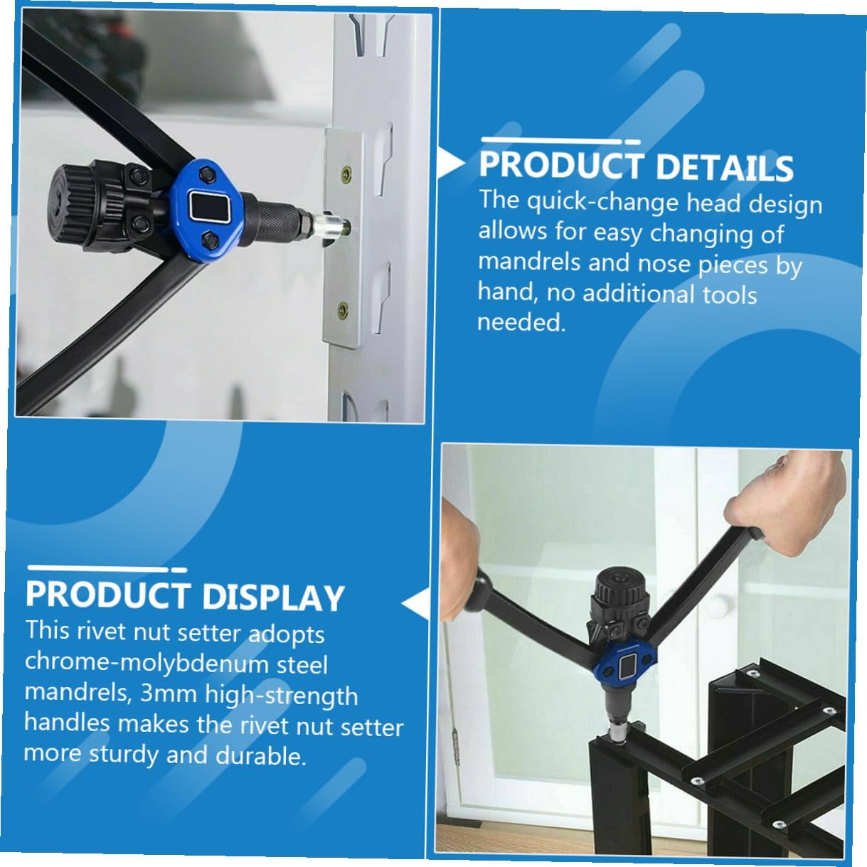 Package Include 1 × Toolbox 1 × User Manual 1 × Wrench 1 × Riveting Machine 7 × Mandrels 130 × Rivet Nuts Characteristics - This thread setting riveter provides a fastener solution for wide riveting applications: body panels, bicycles attachments, furniture and decorations, etc nut insert tool kit. -Product Info:Rivet machine kit -Material: Chromium molybdenum steel, aluminum alloy. -Color: Assorted. -Size: About 32.70X15.50X3.00cm/12.85X6.09X1.18in. - Wide applications and easy to carry, the toolbox is easy to store and carry hand riveters. - Ergonomic handle with double compound hinge, comfortable to hold, simple to use rivet nut tool rivet nut. - It can durability, and the head design can easily replace the mandrel and nose bridge manually nut insert tool. - Versatile and powerful hand nut/ thread setting riveter, takes the hard work out of setting rivet nuts rivet nuts.Goods InformationRivet Nut Tool A set of rivet nut install tool kit including a pack of different mandrels can meet your different needs.rivet nuts tool This is a set of rivet nut install tool kit, made of and good craftsmanship, and can be used for a long time.Manual Rivet Setter This set of rivet nut install tool kit is widely used in automobile manufacturing, which brings great convenience to our work