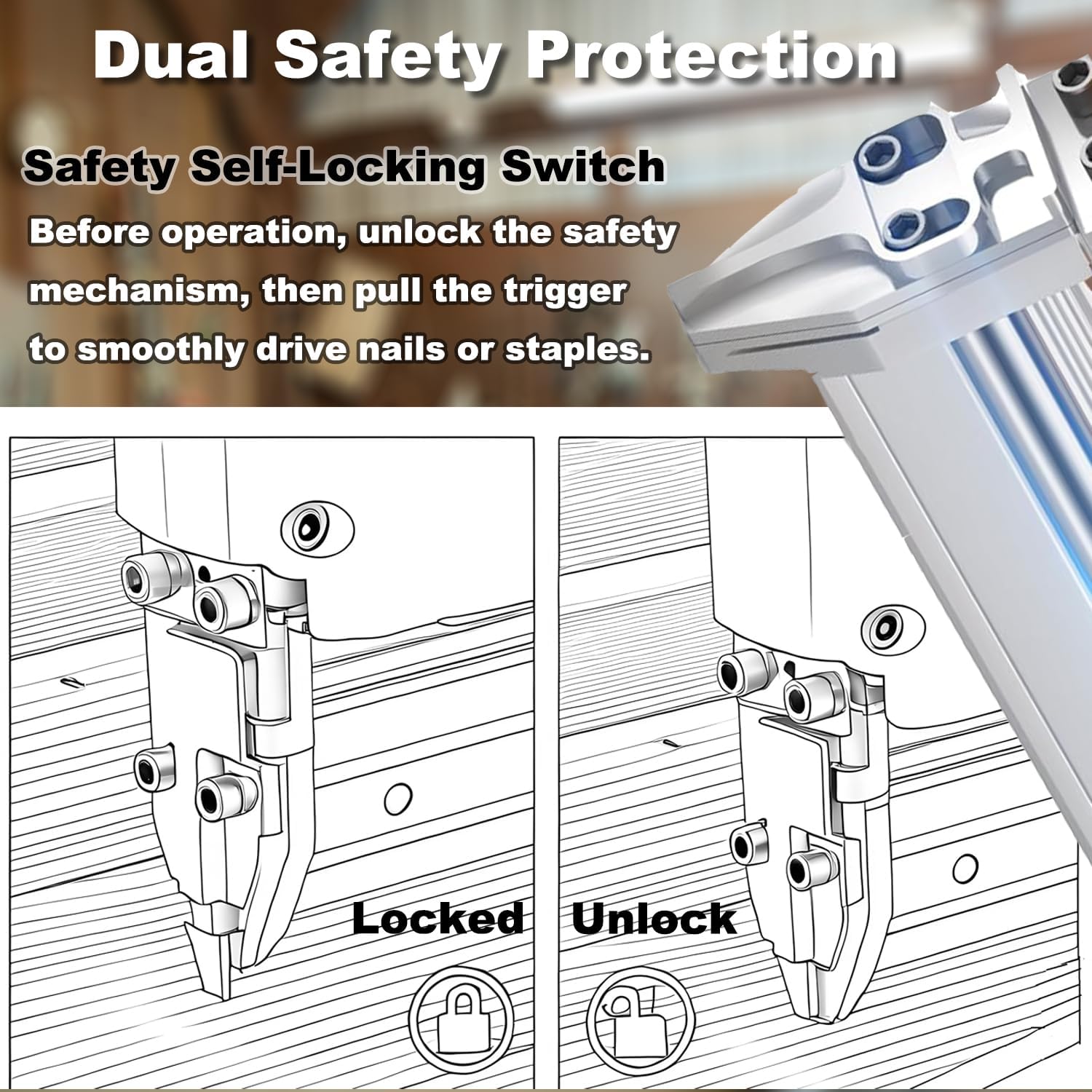 • Dual-Trigger Safety Assurance: 18 Gauge Cordless nail gun with upgraded dual-trigger safety mechanism, it releases nails solely when the main switch and safety contact are both completely pressed onto the work surface, removing the danger of accidental firing