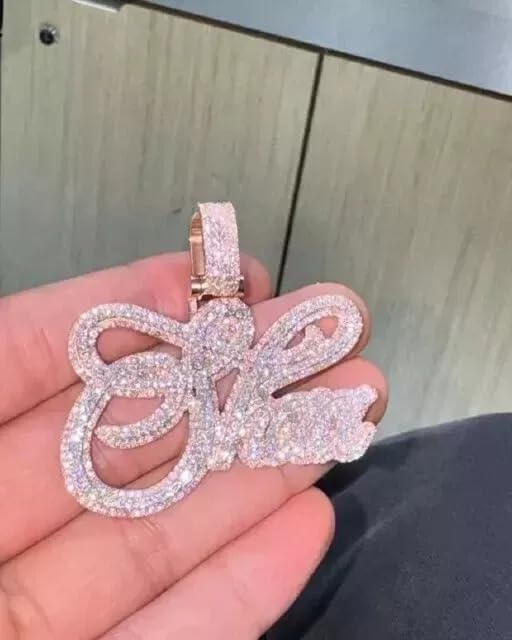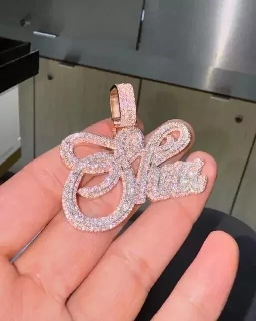 Make a bold statement with this dazzling custom name pendant, expertly crafted with premium Moissanite stones totaling 2 carats. The elegant cursive design features intricate detailing and sparkles brilliantly from every angle. Set in 925 sterling silver with luxurious 14k rose gold plating, this hip-hop inspired piece combines urban style with sophisticated glamour. The pendant showcases high-quality Moissanite stones known for their exceptional brilliance and fire, creating an eye-catching effect that rivals natural diamonds. Perfect as a birthday gift or special occasion present, this customizable pendant allows you to create a unique piece of jewelry that's truly personal. The versatile design works well with various chain styles (chain not included). Each pendant is meticulously crafted to ensure maximum sparkle and durability. Note: This is a made-to-order item that will be customized with your chosen name.