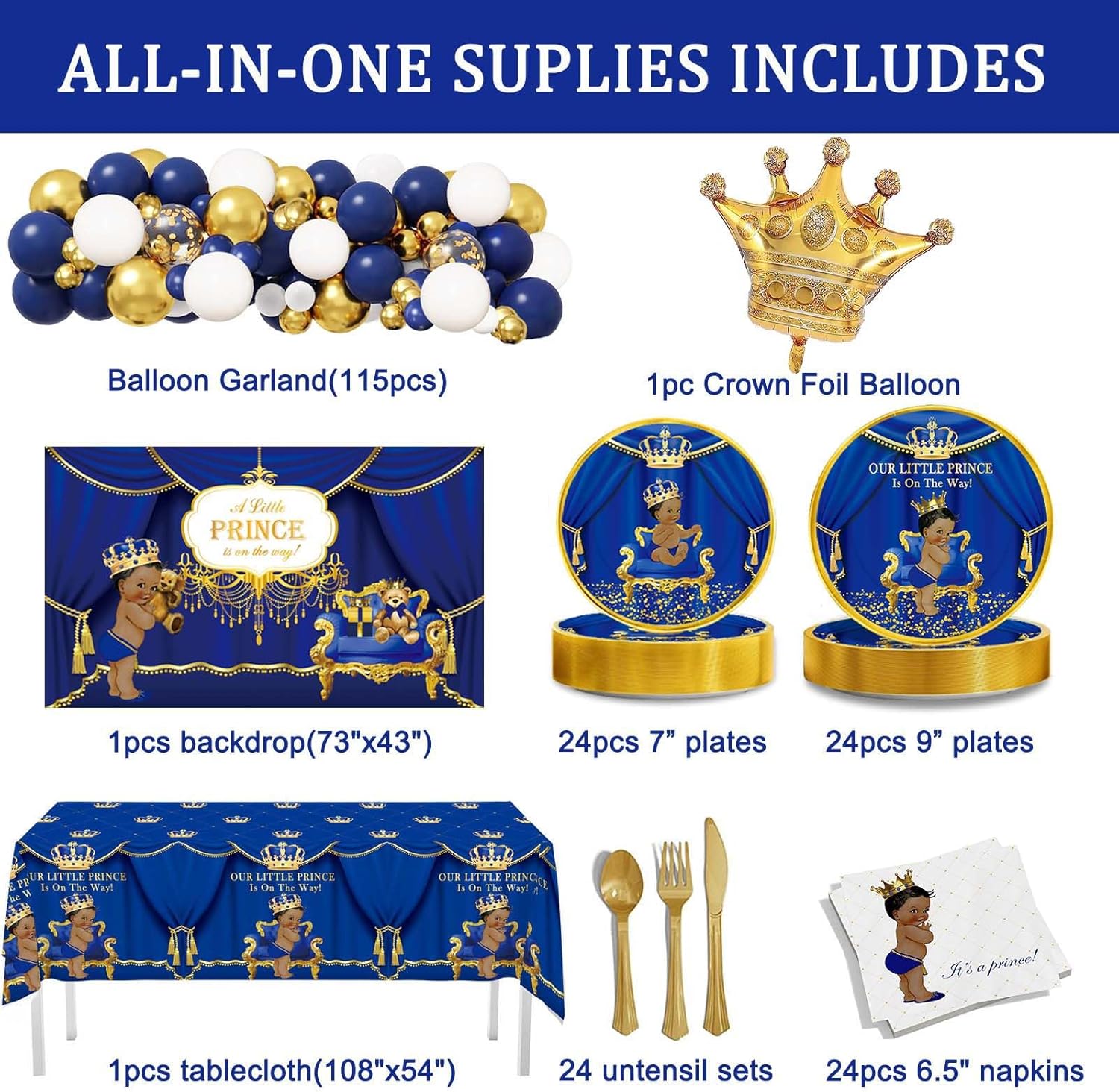 | Included Components | Napkins, Paper Plates, Plastic Forks, Knives, Spoons, Tablecloth, Balloons, Crown Foil Balloon |