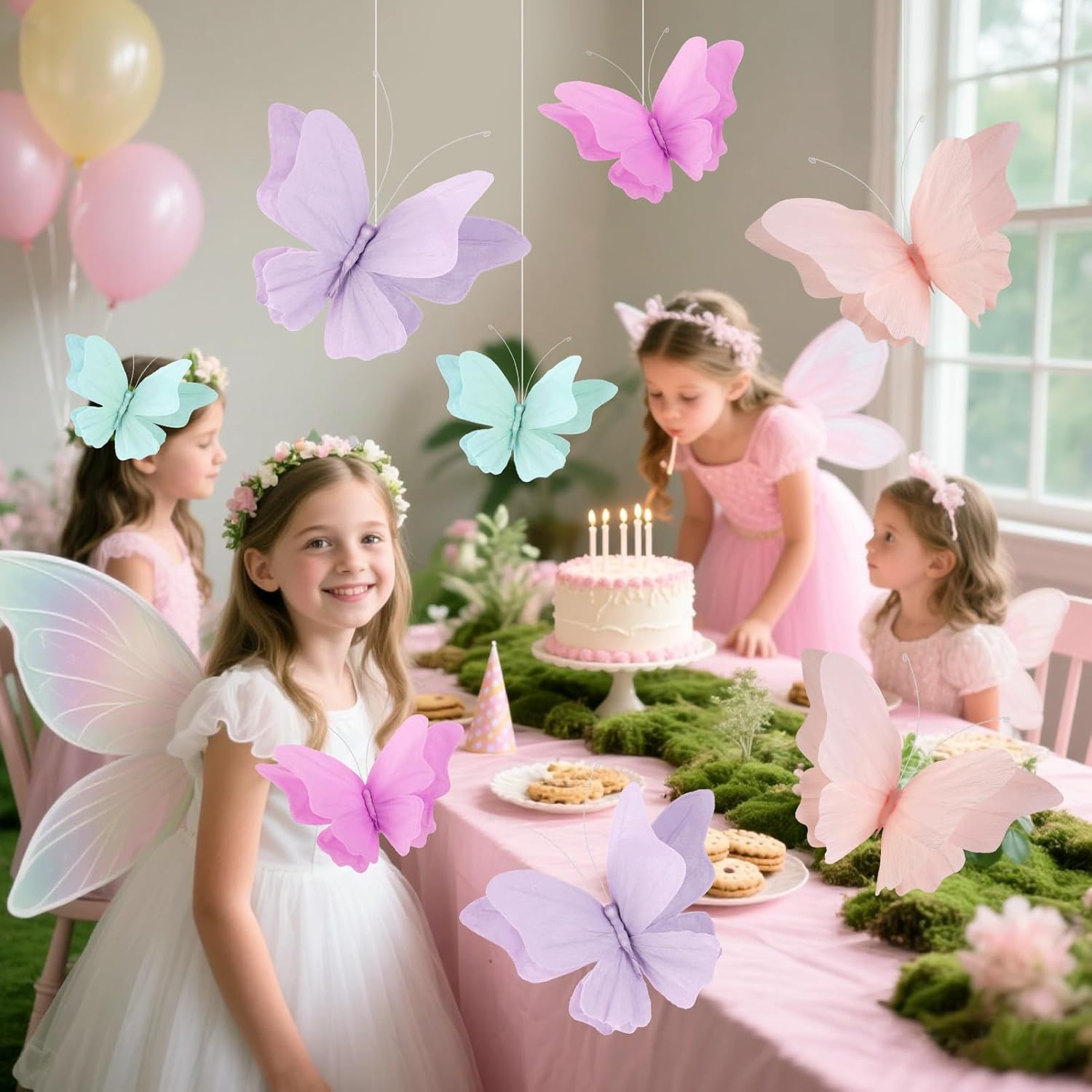 Elegant Hanging Butterfly Decorations – Instantly elevate your décor with this 8-piece paper butterfly decoration set, featuring soft purple, pink, and blue hues. Ideal for birthday parties, baby showers, nurseries, weddings, spring events, and whimsical indoor décor.