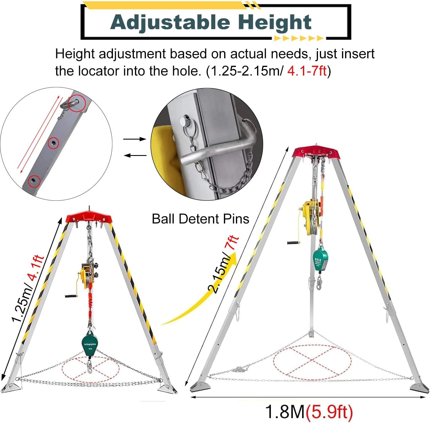 This tripod storage is an ideal tool for traditional confined spaces, providing safe access and emergency rescue, perfect for usage in well, sewer, underground pipe, and tunnels.●Specification- Material: Aluminum Alloy- Leg Adjustable Length: 1.34-2.14m/4.4-7ft- Man Winch Continue Efficiency: 8:1- Manual Handle Force: ≤500 N- Safety Factor: 10- Wire Cable Length: 1200LBS winch-20m/65.6ft-Dia 5mm, 1800LBS winch-25m/82ft-Dia 6mm, 2600LBS winch-30m/98ft-Dia 7mm- Safe Load Capacity: 1200LBS winch safe load 200KG/440LBS; 1800LBS winch safe load 250KG/550LBS; 2600LBS winch safe load 300KG/660LBS●Package Content- 1 x Rescue Tripod Kit ( Includes winch, steel cable, safe belt, falling protector)●Features:- Sturdy steel and aluminum alloys for safety.- Self Locking Winch & Falling Protector.- Adjustable Legs & Anti Slip Feet.- Foldable and Easy to Carry.- Due to the large size of the package, it will be shipped in two parts.●NoteManual measurement, there will be 1-3cm error,please understandDue to light and personal differences in color understanding,there will be small color difference,in kind prevailThe product may be in different stock, so they may be sent separately. Pls do not worry, you will receive ALL the parcels in recent days after the order