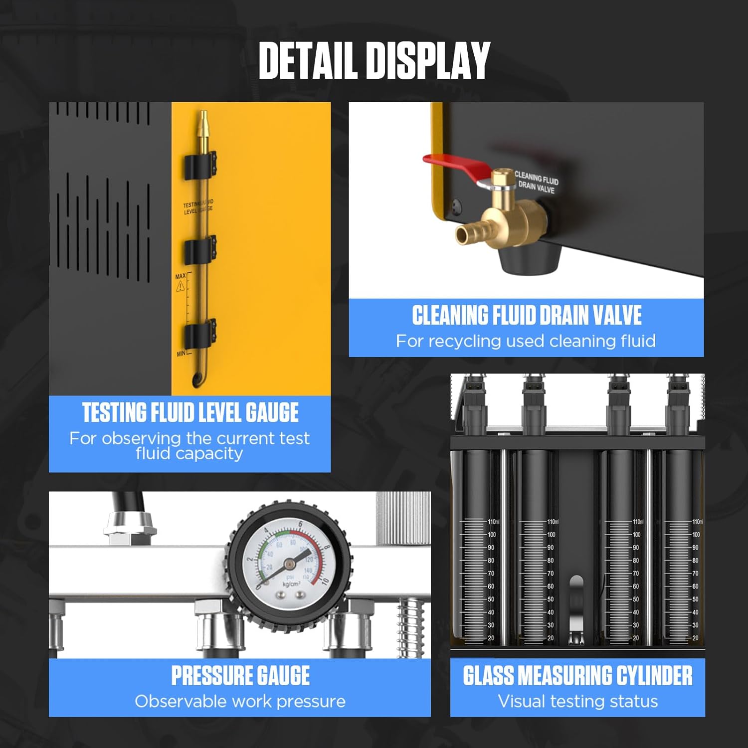 • 🚙【WIDE RANGE OF APPLICATION】The fuel injector cleaner tester kit with replaceable composite joints has good compatibility. Support for most gasoline cars and motorcycles to clean and test fuel injectors. Only clean function for diesel fuel injectors.
