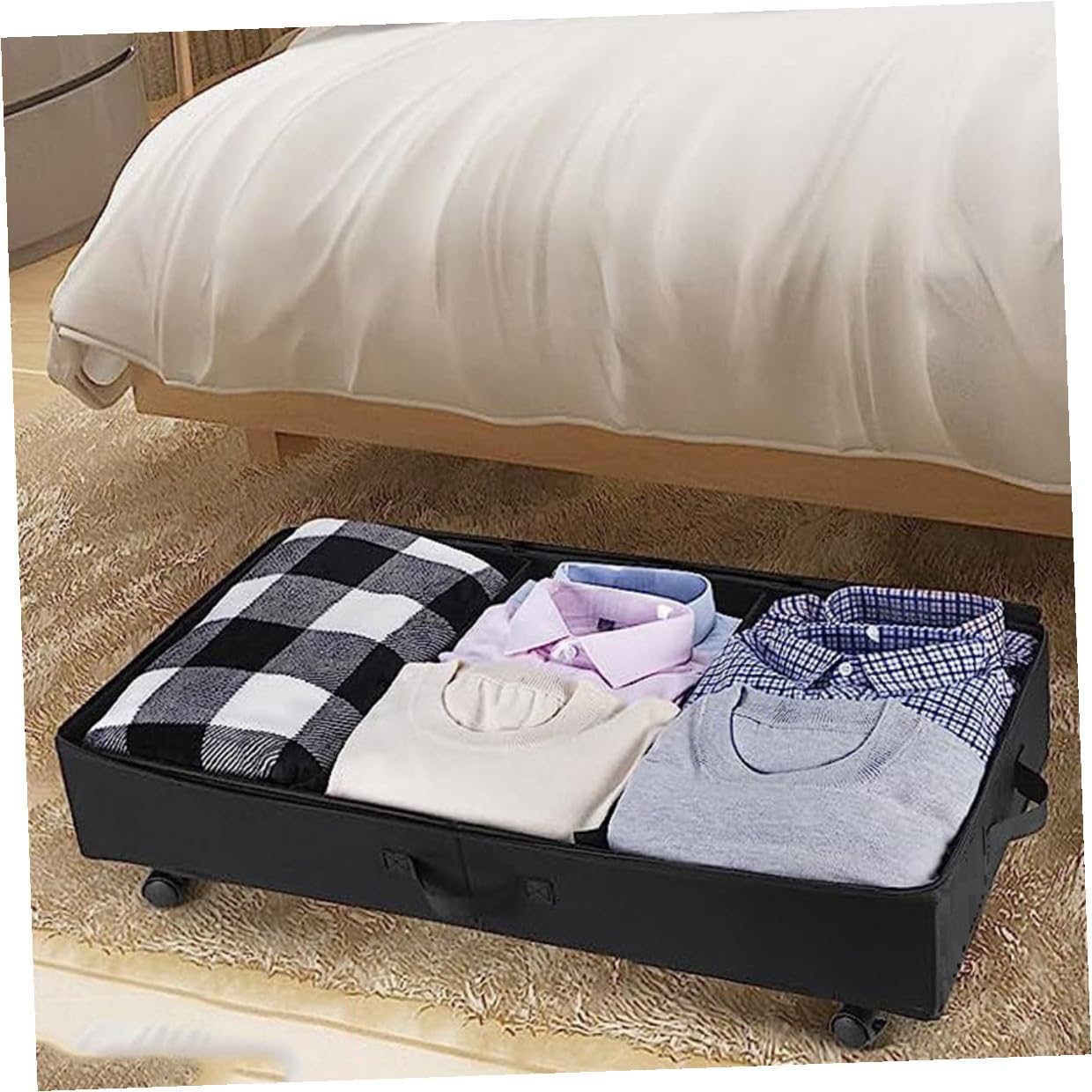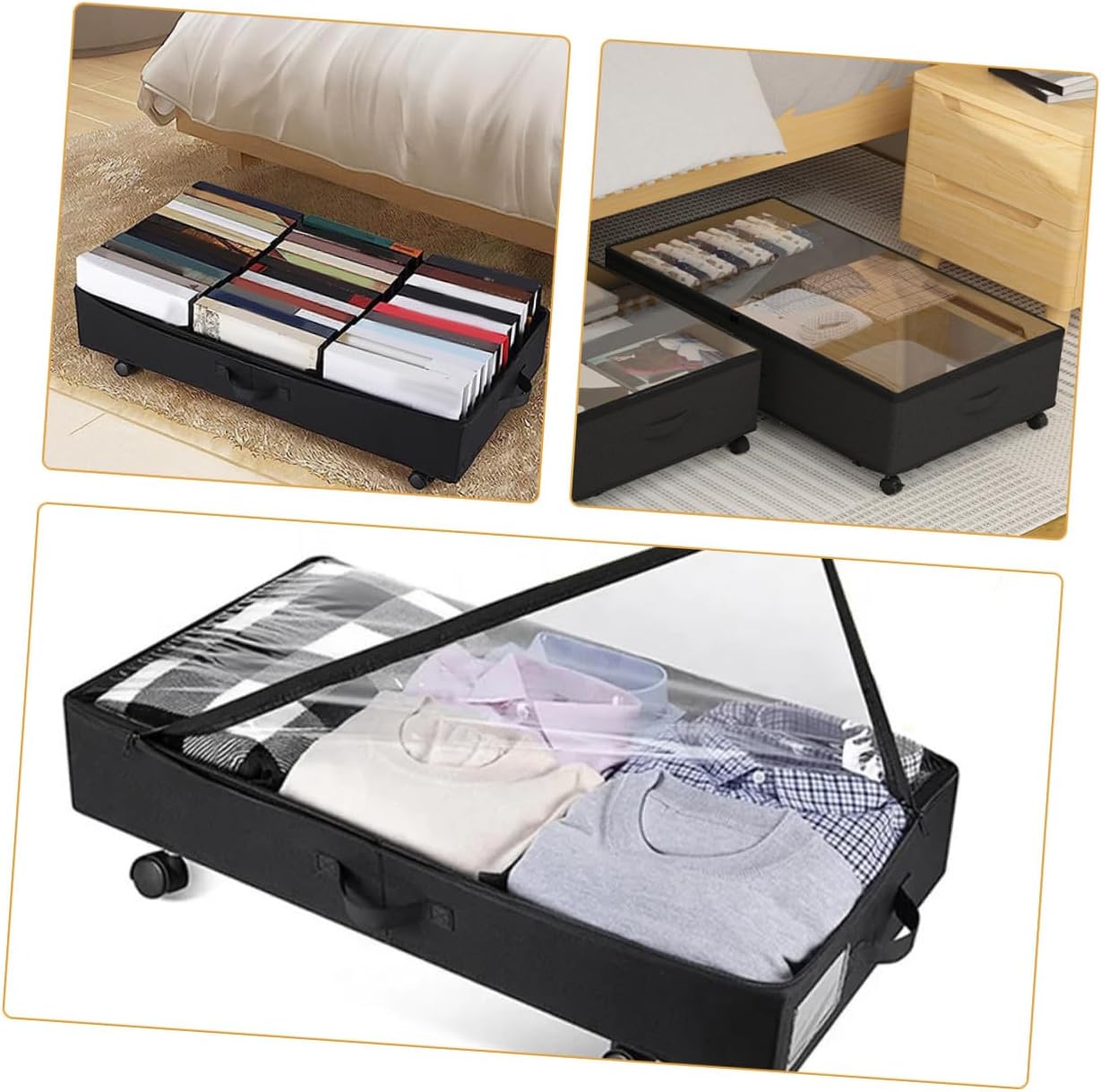 Package List 1 x Under Bed Storage Bag Features -Size:80.00X42.00X16.00cm/31.44X16.51X6.29in -Material:ABS, oxford cloth, iron -Color:Black -Effortless mobility: easily move and retrieve items with the sliding wheels under bed storage container. -Product Info:Under-bed storage truck - You can easily identify the items inside through the transparent PVC window and quickly remove the lid to remove them under bed storage bag. - This storage bag with wheel is great for storage, moving, shipping, laundry and much more storage under bed with wheels. - The zipper storage bin is specially designed for the storage of clothes, quilt, blanket, bedding, etc under-bed storage. - The under bag organizer bag is made with fine workmanship, to ensure the practicality and durability room storage bag.Goods Informationlarge capacity clothes storage bag This storage bag is made of ABS, oxford cloth, iron material, which is and safe, and it keeps your things organized, such as quilt, clothing, blanket, etc.Under-bed Storage Bin It can be easy and convenient for you to carry or grab the handles on the bag and pull the bed