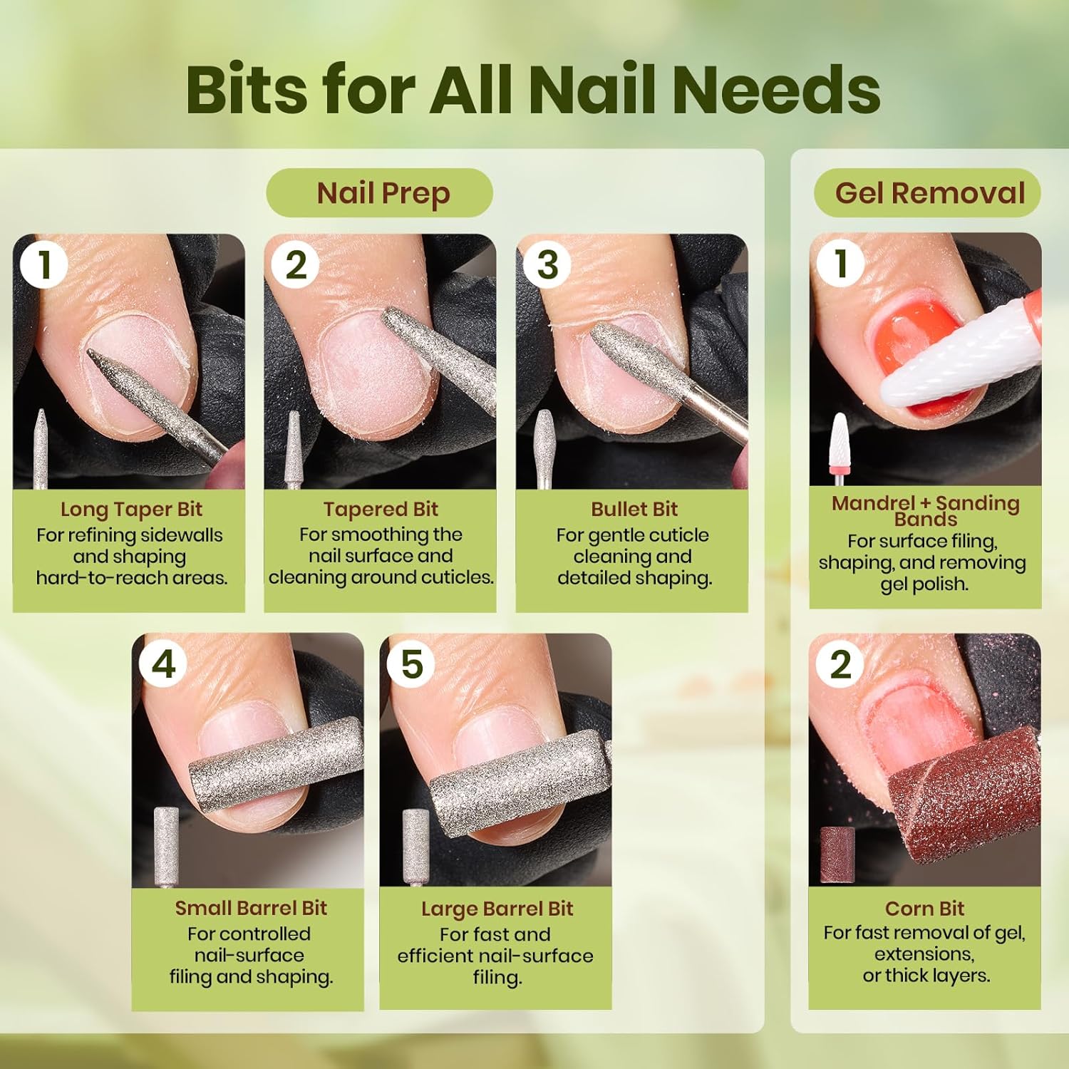• Professional Nail Drill: We provide ceramic corn head x 1, nail drill bits x 6, sanding bands x 6 for use with a matching the nail drill. The speed can be adjusted from 0-12000RPM which can also be controlled in the forward and reverse rotation squares. It is ergonomic and more comfortable to hold. These different bits can be used for grinding, carving, cutting, polishing and cuticle removal. It allows you to complete the entire professional nail art process from start to finish.