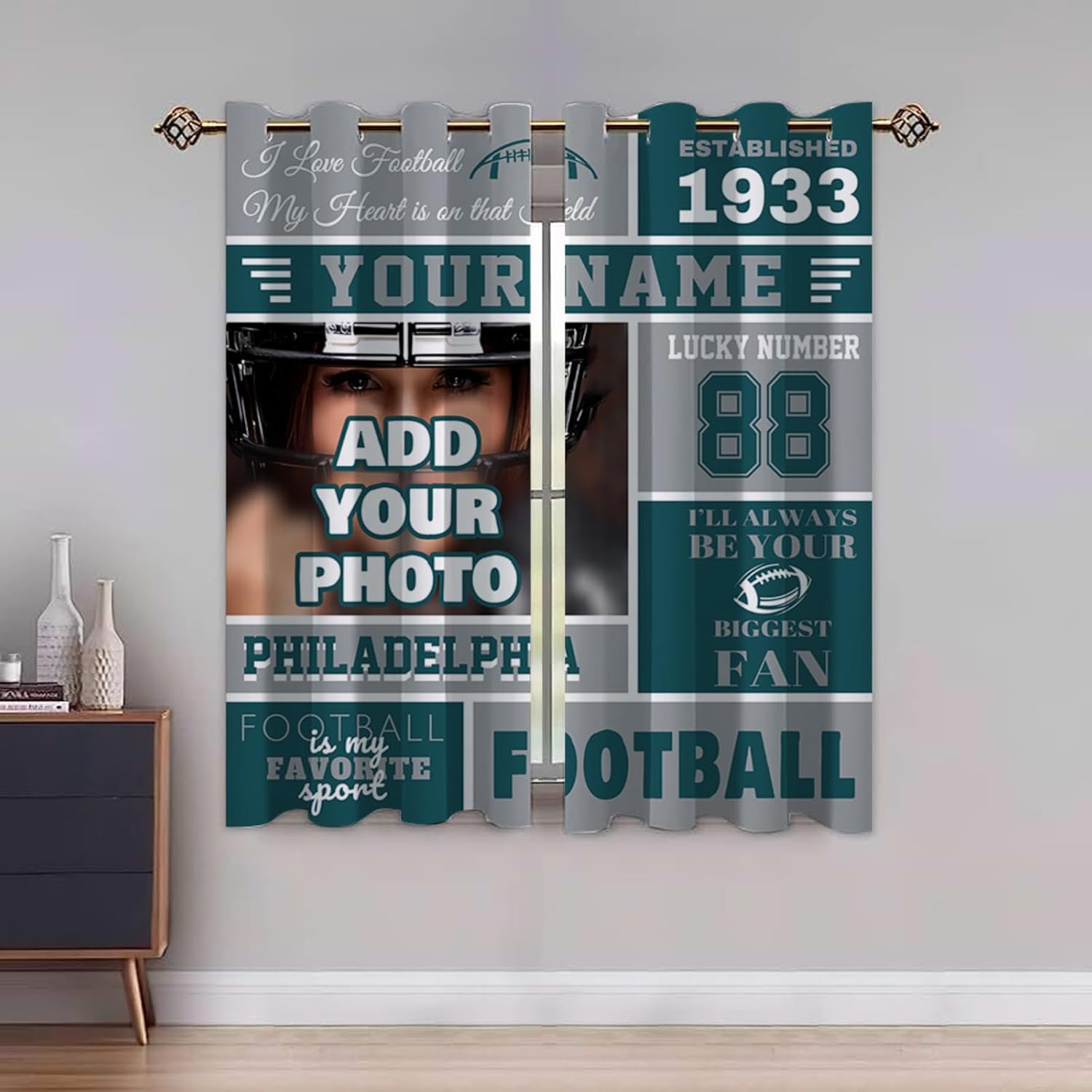 Custom Philadelphia Blackout Curtains, Personalized Football Curtains with Name and Number, Customized Window Drapes Set of 2 Panels for Bedroom Decor