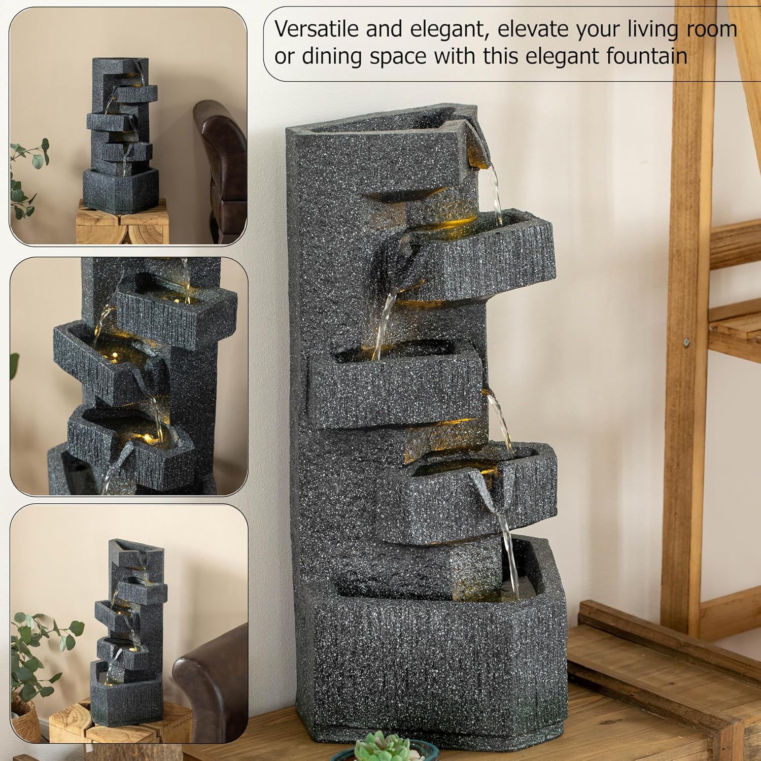 Transform your living space into a serene retreat with this elegantly designed fountain, where artistry meets the soothing presence of flowing water. Its graceful structure enhances any setting—whether placed in a garden, courtyard or as a charming accent on a corner table—creating a visually captivating focal point. The continuous flow of water brings a sense of movement and tranquility, making it an inviting addition to contemporary and traditional landscapes. As the water ripples and glistens under soft lighting, it produces a mesmerizing effect, drawing attention while complementing the surrounding greenery and decorative elements. Beyond its aesthetic appeal, this fountain fosters a peaceful atmosphere, allowing you to escape the hustle and bustle of daily life. The gentle water flow creates a natural, rhythmic sound that soothes the senses, making it perfect for relaxation or enjoying a quiet moment. Whether positioned near a seating area or tucked within a landscaped garden, it enhances the ambiance with its calming presence, promoting a feeling of harmony and balance. Its versatile design integrates with different styles, from rustic retreats to modern outdoor lounges. Whether used as a striking centerpiece or a complementary accent, it adds character and sophistication to any environment.