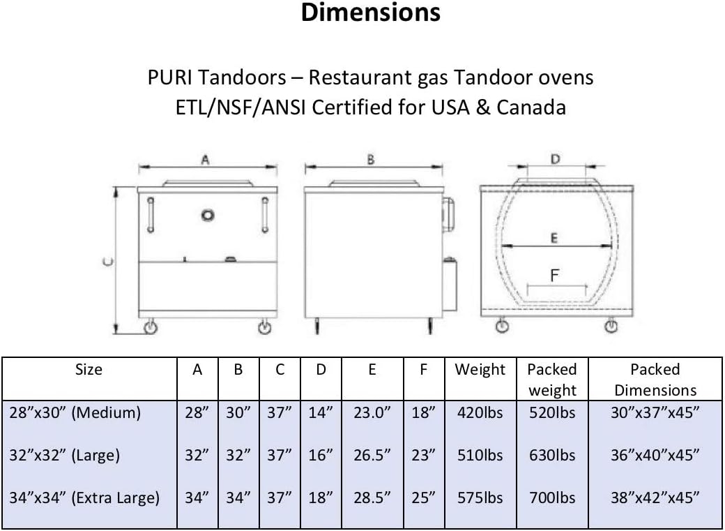 ETL/NSF/ANSI certified restaurant gas tandoor size 32x32x36" with 16" mouth It comes with following accessories . 1 x Fitted gas burner of stainless steel with automatic piezo ignition, flame failure safety, Italian Gas valve . 4 x Castors/wheels · 10 x SS skewers · 2 x Naan bread rods · 1 x Naan cushion/gaddi · 1 x temperature guage · 1 x stainless steel lid · 1 x Burner Baffle plate . 1 x bag of clay balls · 1 x Lump of repair clay . 1 x Bottle of Tandoor oil 10 skewers will be mixed as specified below: 5 x 4mm round SS skewers 5 x 6mm square SS skewers 2 x 8mm round SS naan bread rods ( hook & scrapper)