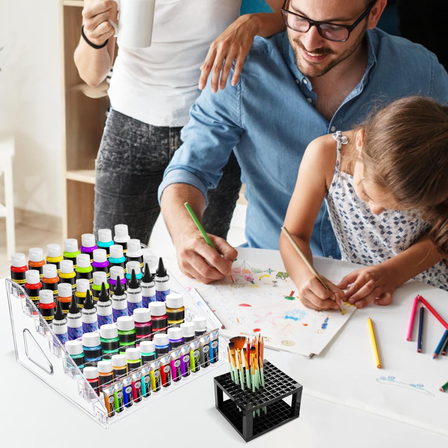 4 Pcs Clear Acrylic Paint Organizer Rack with 2 Brush Holder, 7 Layer Acrylic Paint Tube Organizer, Snap-On Craft Organizers and Storage for Versatile Storage, No-Tools Setup & Quick Access