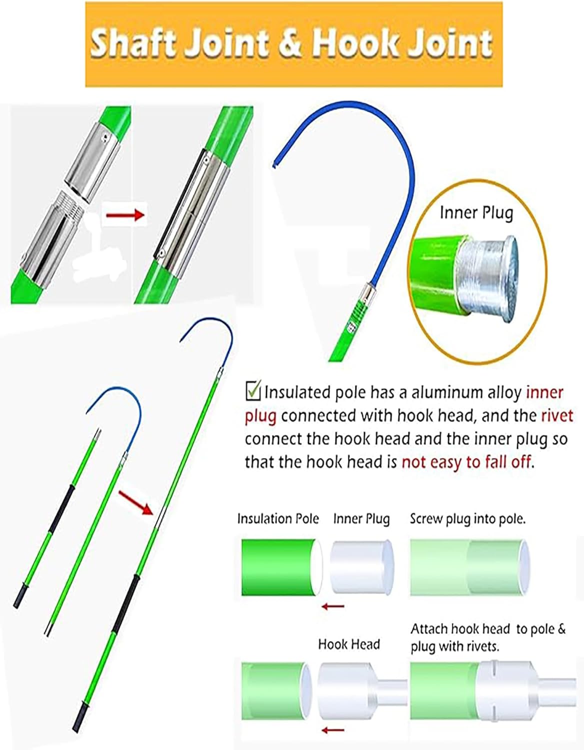 - Length: 3m / 118in- Sections: 2- Withstand Voltage: 220kV**Pole Specifications:**1. Material: Epoxy resin insulation rod2. Color: Red3. Length: 300cm / 118in**How to Use:**Simply hold the handle and position the hook under the armpits, waist, or other easy-to-pull areas to safely pull an electrocuted individual away from danger.**Package Includes:**- Insulated Rescue Hook x 1
