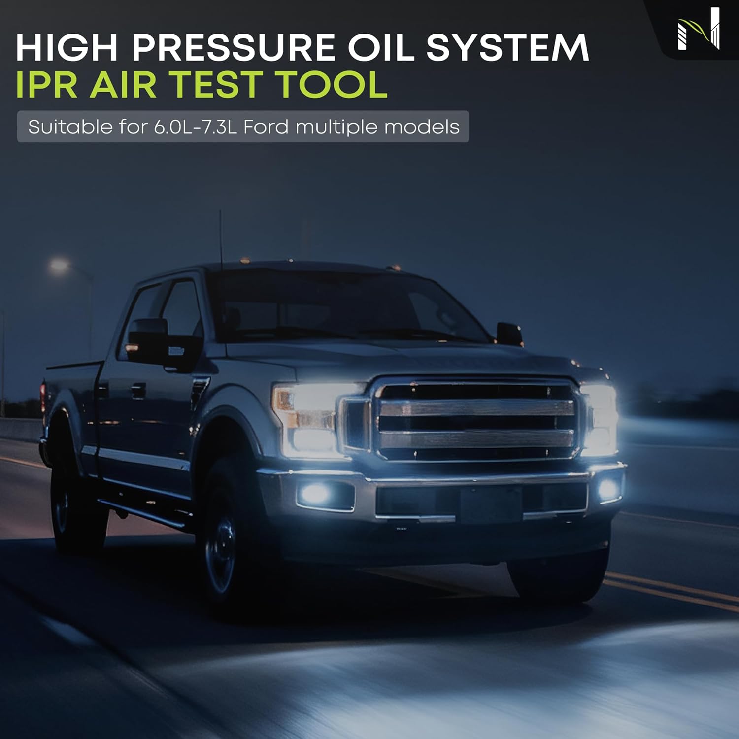 Product Description:Tired of chasing elusive high-pressure oil leaks on your 6.0L or 7.3L ? Our professional-grade IPR Air Test Kit is the ultimate diagnostic solution designed to save you time, money, and the headache of unnecessary engine teardowns. This specialized tool allows you to pressurize the entire high-pressure oil system with shop air, making any leak—no matter how small—audibly detectable.Why This Kit is a Must-Have for Every Diesel Mechanic:Unmatched Compatibility: Precision-engineered to fit 6.0L and 7.3L engines, including systems with the latest updated standpipes and dummy plugs.Seals the System Completely: The tool replaces the IPR valve, creating a perfect seal. This enables you to pressurize the entire system to identify leaks from standpipes, dummy plugs, injector O-rings, adapter seals, and the HPOP itself.Proactive Maintenance: We highly recommend air testing every 6.0L engine after any part of the high-pressure oil system has been serviced. This simple step verifies your work and prevents costly comebacks and secondary repairs.How It Works (Simplified):Remove the IPR valve (located under the turbo).Thread our test fitting into the IPR port and hand-tighten.Connect your shop air line to the tool’s quick-connect coupling.Listen for leaks! Use the shutoff valve to seal the system and isolate the smallest leaks.
