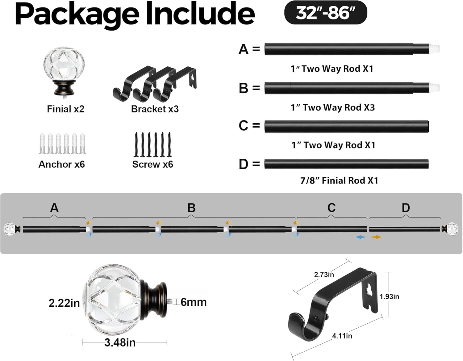 Founded in 1998, philosophy of our company is: "Beginning with design, loyal to quality." Through the Amazon platform, KAMANINA is committed to becoming a world-famous, favorite home brand for customers. The KAMANINA curtain rod has a classy look and looks great with the modern and crystal finials. We have many style rods on our store for your choice! Specification: Material: Iron Size:32-58",48-84",66-120",72-144" Rod thickness:0.6mm Color Options: Silver/Black/Gold Projection: Roughly 5 inch from the wall to the front rod and 2.5 inch from the wall to the back rod. Q&A: 1.What if the package is broken or missing accessories? If there is any problems with the product you received, please feel free to contact us via Amazon. 2.Can I replace the finials? The interface of our finial is a standard M6 screw. If your finial has an M6 screw interface, it can be used on our product. 3.What is the distance between the front and rear rods? How far are they from the wall? The distance between the front rod and the back rod is 1.8 inch; the back rod is 2.5 inch from the wall.