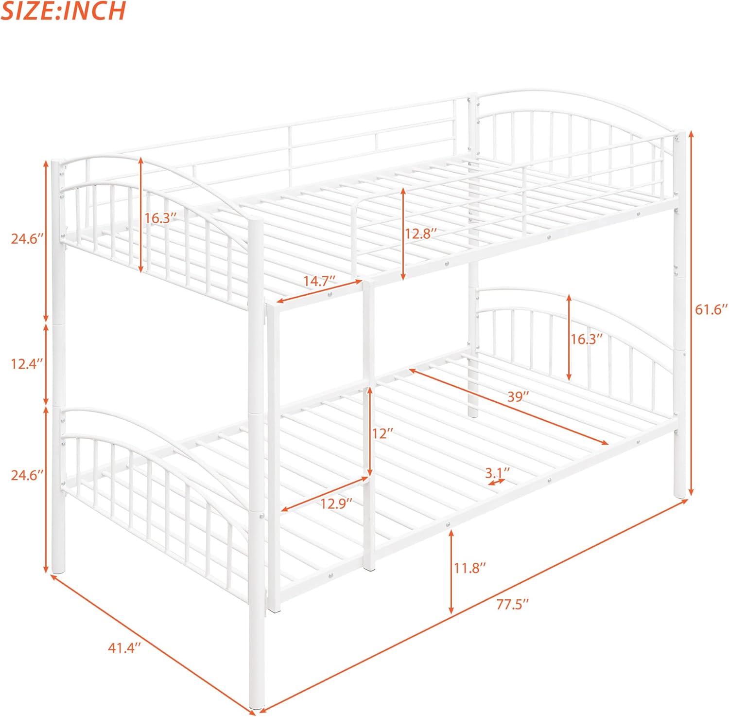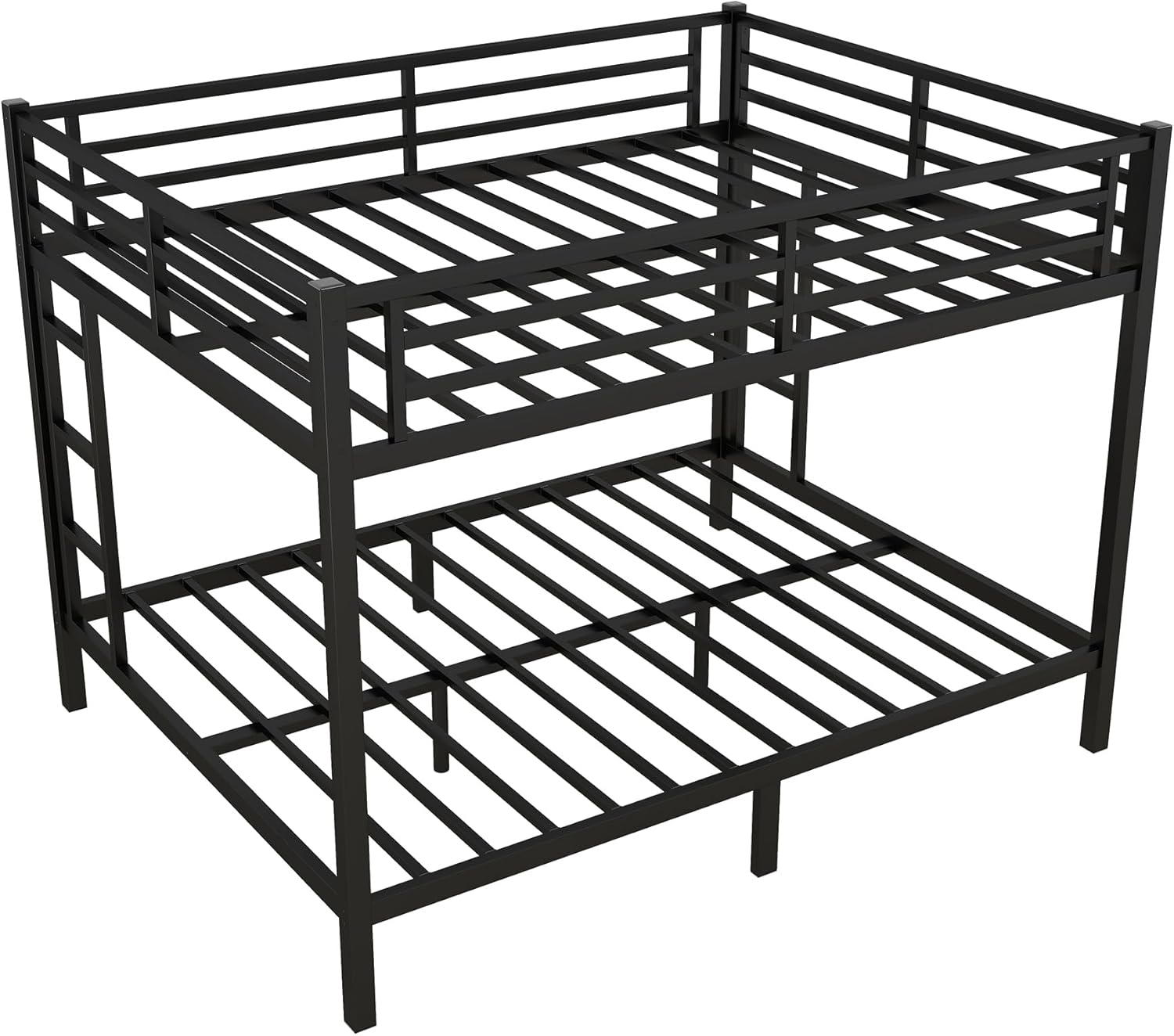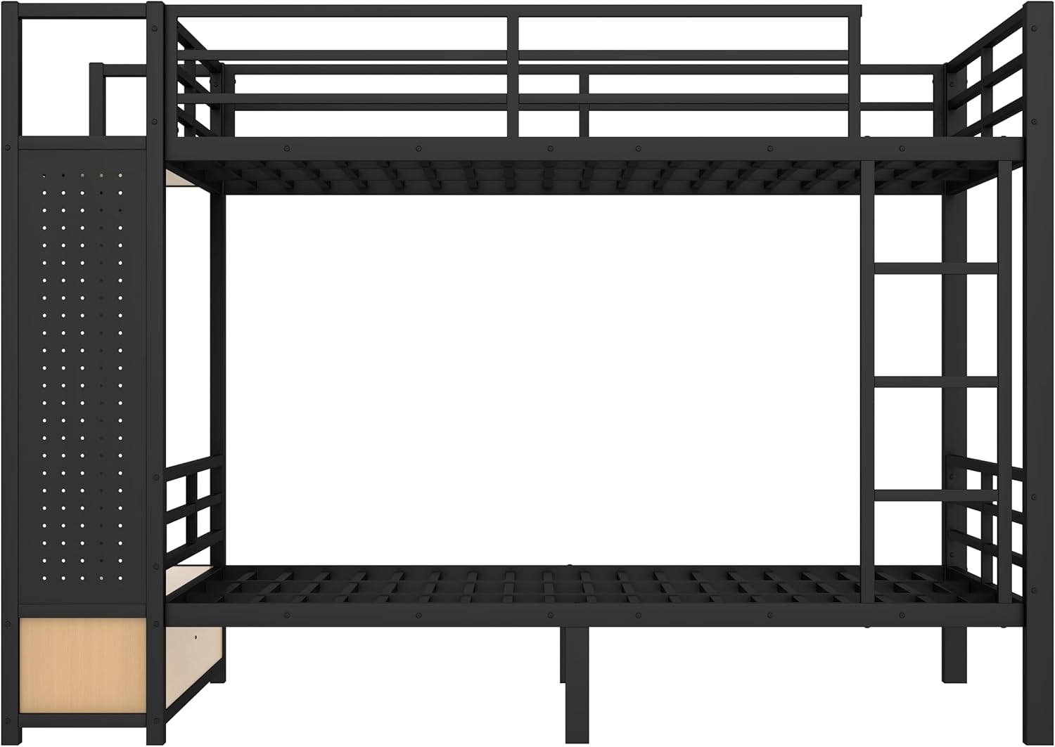 ๐This stylish metal bunk bed with desk is made with sturdy metal and has a clean-cut silhouette that can be matched with any room decor. The lateral 3-layers ladder of the bunk bed can be used as shelves to lay out home items for you.And the wardrobe underneath the ladder is an elegant design which offer you space to store everyday clothes.It will definitely save plenty of space for you.An ideal space-saver and a perfect addition for a growing family, the bunk bed efficiently accommodates little ones, and young teens, allowing them the freedom and space to host friends.This bunk bed will be a beautiful and practical piece in your bedroom. โ โ โ Weight & Dimensions Overall Product Dimension: 92.7"L x 55.6"W x 67"H Number of Package: 2 Overall Product Weight: 135.58 LBS Weight Capacity Upper Bed:250lbs;Bottom Bed:350lbs Recommended Mattress Thickness Upper Bed:4-6inch;Bottom Bed:6-8 inch Recommended age: > 6 years old โ โ โ Specifications Product Type: Bunk Bed Size: Full Over Full Color: White/Black Material: Iron The number of slats: 20pcs+20pcs Assembly Required: Yes Country of Origin: Vietnam โ โ โ Notes: 1. Manual measurement has been used,there may be some reasonable error. 2. All the pictures are taken by actual samples, slight chromatic aberration may occur due to lighting or display.