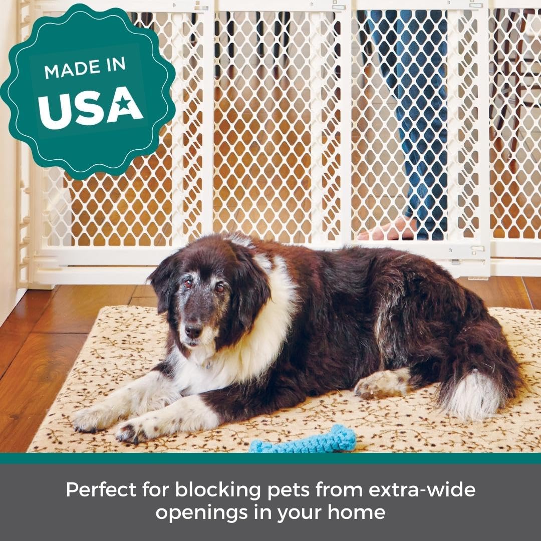 The MyPet Extra-Wide Petgate from North States is specially designed for those extra-wide openings in your home. Adjusts to fit openings 22" to 62" wide and is an extra-tall 31" high, this gate is ideal to keep your pet safe and secure. This gate easily hardware mounts for added stability – all mounting hardware and brackets are included. When using the gate, simply slide the panels together with one fluid motion. The gate opens and closes with ease. When not in use, simply swing the gate out of the way. Storage is a snap, just remove the gate from the mounting brackets – it’s that easy. When it comes to pet gates for doorways, puppy gates for the house, pet gates for cats, large dog gate indoor use, extra wide pet gates for large openings, North States has you covered!
