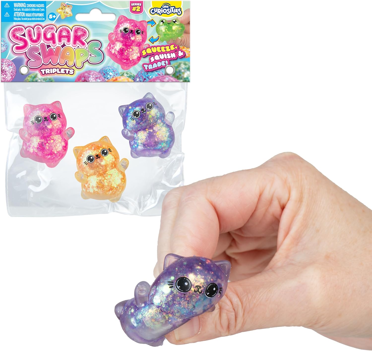 The newest sparkling toy sensation from ORB Toys is here with Sparklee Sugar Swaps! These adorable sparkling and slow rising sugar squishies are not only fun stretch and squeeze - they are perfect for collecting and trading with friends and family! Now double your fun with the ORB Sugar Swaps Frogs and Cats 2 Pack. Each of these 2 Packs will include 1 Pack of 3 Sugar Swaps Frogs (1 Blue Sugar Frog, 1 Pink Sugar Frog, and 1 Green Sugar Frog) and 1 Pack of 3 Sugar Swaps Cats (1 Purple Sugar Cat, 1 Orange Sugar Cat, and 1 Pink Sugar Cat). Smush, squish, and squeeze these wildly fun, glittery, and vibrantly colored frog and cat squishy toys for a unique tactile and sensory experience! Sparklee Sugar Swaps are made with ORB's proprietary sugar-water formula, giving them a slow rising, honey-like feel that makes them a excellent squishy toy for stress relief and anxiety. Sparklee Sugar Swaps are super durable and washable (just rinse with warm water when needed!) for extra long lasting fun - perfect for bath time entertainment! So irresistibly cute, soft, and squishy, Sparklee Sugar Swaps make for fun and exciting gifts for both kids and adults - perfect for party favors, goodie bags, birthdays, office and executive desk toys, prizes, rewards, holidays, Christmas stocking stuffers, Easter baskets fillers, and little everyday gifts that everybody can enjoy! Once you pick them up, you just won’t want to put these sugar squishies down! Their high quality, non-toxic, child-safe materials ensure that the super squishy ORB Curiosities Sugar Swaps are suitable for children and ready for long lasting fun! Get your Sugar Swaps Frogs and Cats 2 pack today, and start collecting, trading, and playing with your favorite new squishies! Can't get enough of these adorable Cat and Frog Sugar Swaps? More fun, squishy and squeezy Curiosities from ORB Toys are available now including more Sparklee Sugar Swaps 2 Packs (Ducks & Babies, Bears & Babies, Butterflies & Bunnies, Dogs and Aliens, Paws & Bunnies), Sparklee Axolotls, Sparklee Capybaras, Glow in the Dark Cool Cubes, Sqweezy Gumdrops, Expand-A-Ball (Jumbo, Extreme, & Flower), Sugar Smooshies (Metallic, Softees, Fruit Salad), Wiggly Dog, Pop-Petz, Jelly Bears, Mochi Donut Bracelets, Light Up Jiggly Bracelets, Dinosaur Jelly Friends, Animal Friends Puzzle Erasers, and tons of new Tabalicious TABA squishies! Be sure to check the rest of the ORB Toys product line including: Funkee Monkee, Curiosities, Secret Menu, Very Beary, Easy Sqweezy, G.O.A.T ORB Slime, Pure Bread Pets, Sugar Swaps, Flower Snaps, and PlushCraft!