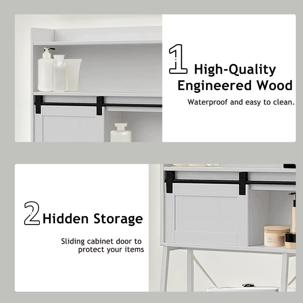 Product Information Product Name:Over The Toilet Storage Cabinet with Toilet Paper Stand, Mass-Storage Over Toilet Bathroom Organizer with Sliding Door, Space-Saving Toilet Rack, for Bathroom, Laundry, Christmas Gift (WHITE) Main Color:White Main Material:+Metal Product Dimensions Assembled Length (in.):Not Applicable Assembled Width (in.):Not Applicable Assembled Height (in.):Not Applicable Weight (lbs.):Not Applicable Package Size Length (in.):38.61 Width (in.):22.06 Height (in.):4.73 Weight (lbs.):37.46 Product Features Super Stability: The metal X-shaped frame crossbar and wall fixing nails ensure the safety of the bathroom organizer shelf over toilet , preventing tipping and shaking. The anti-fall cabinet design allows for secure storage of unstable items. Non-slip feet maintain overall stability and protect the floor from scratches. Multifunction: This bathroom rack over the toilet with the top open shelf is an easy solution for bath towels, skincare, and shampoo, The lower cabinet leaves room for your roll paper. This toilet rack barn door design hides your secret private information and maximizes the available storage space for different-sized supplies. The bathroom is too small to store your items? Is your bathroom tiny? Let the toiletries on the wall make full use of the space over the toilet without occupying the floor area. The Freestanding over the toilet storage unit helps keep your toiletries organized without taking up too much floor space, and the shelf of the over-the-toilet bathroom rack allows you to place items as you like. Please note: The 32.3'' width before ordering Make sure enough space for the shelves