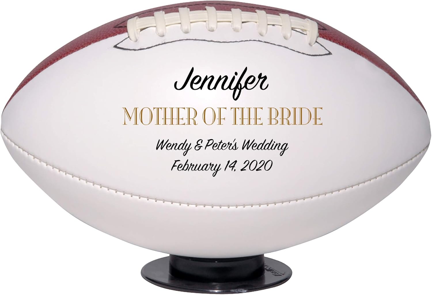 This personalized ring bearer football wedding gift comes in 3 sizes: mini 6 inch, mid 9 inch, or full 12 inch. Custom made to order with your ring bearer’s name, the wedding party and date, this football is the perfect wedding gift for toddlers, little boys, and older boys. Our footballs make for a fun and exciting ring bearer proposal gift. There is no better way to ask someone to be your ring bearer, especially if he’s a big football fan, than with a customized football that not only tells him how well you know him, but also how much he means to you. Not only that, but it can serve as a snazzy save the date! Show your appreciation by commemorating your wedding day with a ring bearer football gift from the bride and groom, or as a gift to the ring bearer from his parents. It is sure to be a wedding keepsake that your ring bearer cherishes for years to come!
