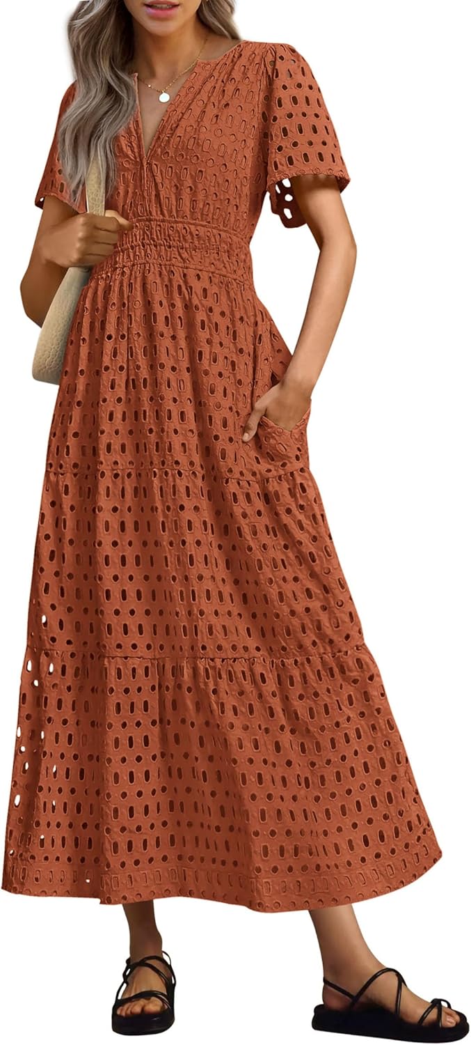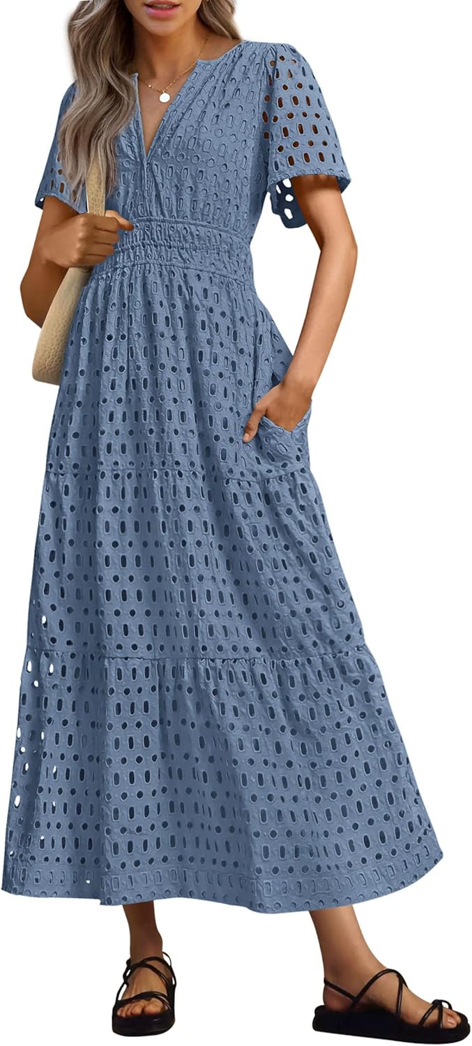 PRETTYGARDEN Long Flowy Dress for Women Eyelet Maxi Beach Vacation DressLong Flowy Dress Boasts A Gorgeous Eyelet Texture That Drapes Gracefully over Your CurvesWomens A Line Dress Flatters Any Body Type and Features A Ruffle Swing Hemline That Adds Feminine Charm This Going Out Dress Offers A Versatile Style That's Both Casual and Chic at The Same TimePRETTYGARDEN Women’s V Neck Maxi Dress Short Sleeve Holiday Party DressThis Eyelet Maxi Dress Is Crafted from A Soft and Lightweight Fabric, Making It Suitable for Summer DaysThe V Neck Dress For Women Highlights Your Neckline and Adds A Touch of Elegance to Your LookSwing Dress for Women FeaturesWomens High Waist Dress Flatters Your Figure and The Short Sleeves Provide A Cool and Breezy FeelPRETTYGARDEN Summer Dress for Women V Neck Hollow Out Long A Line DressWomen Ruffle Swing Dress Has Flounces That Gracefully Sway as You Move, Making It Ideal for Any OccasionsThe Unique Blend of Comfort and Style Is What Sets This Short Sleeve Maxi Dress Apart from OthersSummer Maxi Dress for Women Is A Timeless Piece That Is Both Sophisticated and StunningPRETTYGARDEN Womens Eyelet Maxi Dress Casual Summer Going Out DressesFabric Type: 100%CottonFashion Style: Short Sleeve/V Neck/Eyelet/Solid Color/Elastic WaistOccasions: This long flowy dress is suitable for many occasions,such as party, wedding guest, daily, dating,holiday, beach, travel, etc.Garment Care: Machine wash or hand wash in cold water/Do not blench/Hang to dryPRETTYGARDEN Womens Long Flowy Dress V Neck Embroidery Wedding Guest DressPRETTYGARDEN Maxi Dress for Women Elegant Eyelet Ruffle Long Swing Dresses