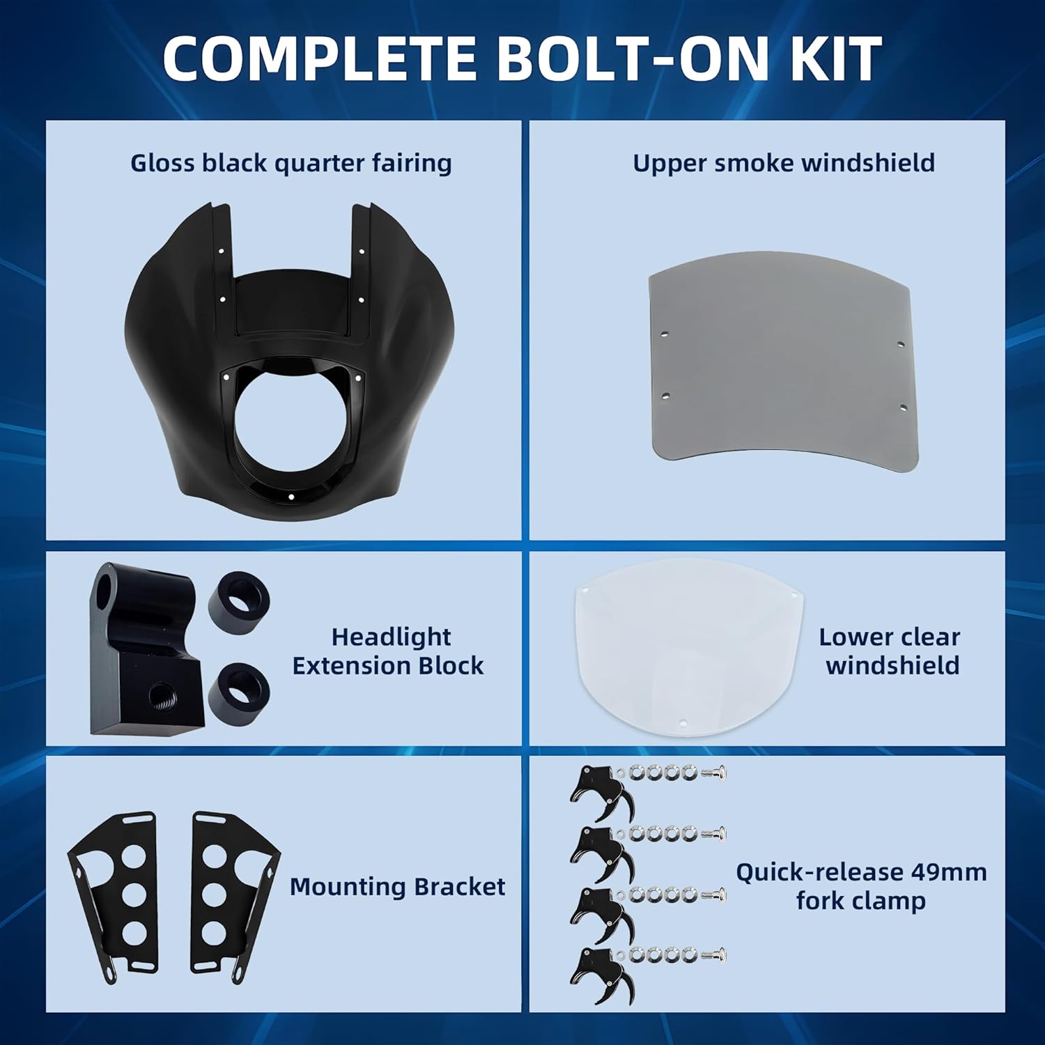 | Included Components | Gloss black quarter fairing × 1, Quick-release 49mm fork clamp × 4, Upper smoke windshield × 1, lower clear windshield x 1 |