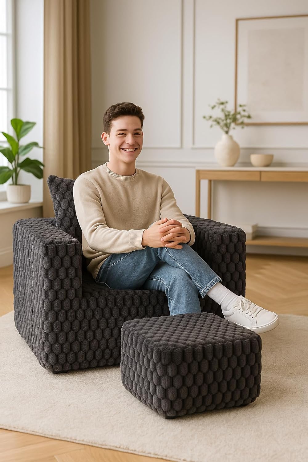 Transform your living space with the Yizom Linge corduroy compression sofa set, featuring a distinctive quilted texture that adds both visual interest and supreme comfort. The set includes a generously sized chair and matching footstool, crafted with an eye-catching honeycomb pattern in sophisticated charcoal gray. corduroy upholstery creates a cozy, inviting texture that begs to be touched, while the modern geometric pattern adds contemporary flair to any room. Perfect for reading nooks, living rooms, or bedroom corners, this versatile set combines style with functionality. The substantial build and careful attention to detail ensure this furniture piece will become a striking focal point in your home, while its neutral color palette allows it to complement various decor styles. The deep seat and supportive structure provide optimal comfort for relaxation, reading, or simply unwinding.