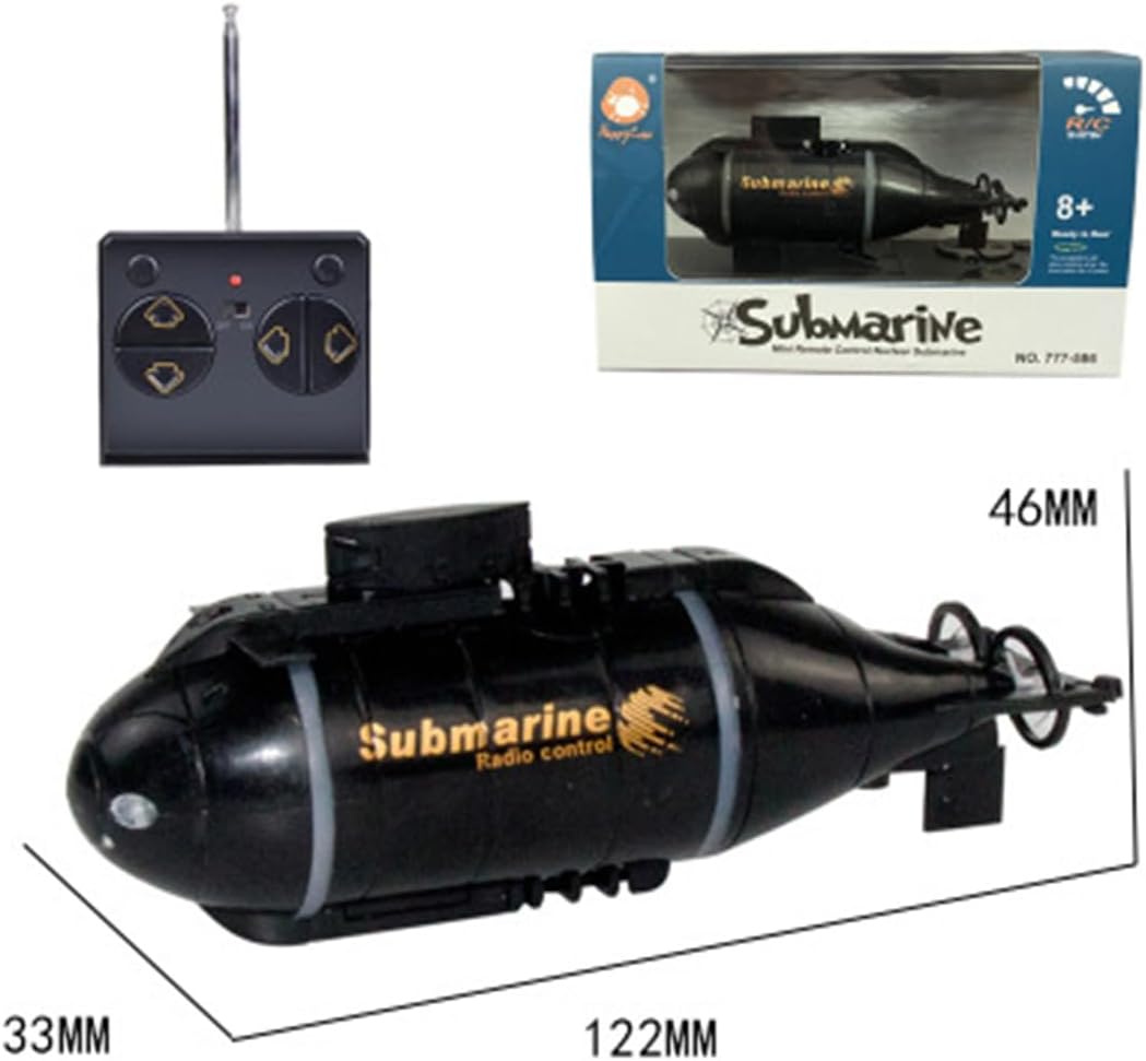 Specifications:.Material: Plastic.Color: Black.Charging Time: 20 minutes.Usage Time: 10 minutes.RC Distance: approx. 8 meters.Diving Depth: approx. 1 meter.Product Weight: 68g.Package Weight: 266g.Product Dimensions: 12 x 3.5 x 4.5cm.Package Dimensions: 16 x 8 x 9.5cm.Packing: Graphic Carton.Ages: 16+Package Including.RC Submarine *1.USB Charging Cable *1.Remote Controller *1.Remote Controller Antenna *1.Propeller *2