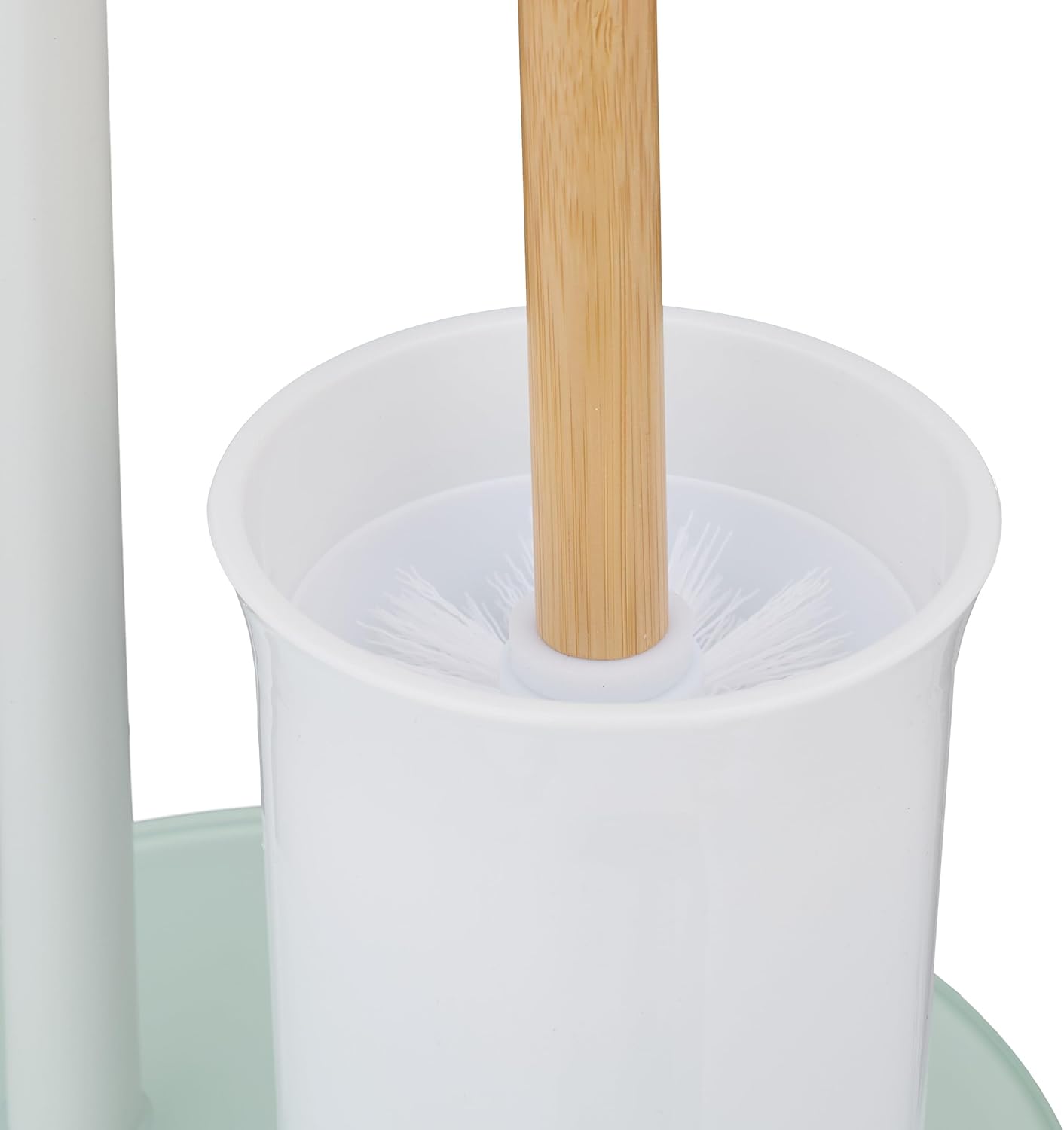 Keep your toilet paper and brush close at hand with this stylish toilet butler. Whether in the bathroom or the guest toilet, the freestanding toilet set can be positioned flexibly and does not need to be fixed to the wall. The modern design of the toilet stand in a mix of stainless steel, bamboo and glass is a great eye-catcher in the bathroom. The replaceable brush head with 2 spare brush heads and the removable plastic brush container ensure hygiene.Toilet Set in Detail- Size H x W x D: approx. 64 x 27 x 22 cm- Weight: approx. 1.2 kg- Material: Stainless steel, bamboo, glass, plastic- In various coloursDetailed Dimensions of the Toilet Set- Toilet brush holder H x D: approx. 14.5 x 10.5 cm- Inner cup toilet brush holder H x D: approx. 10.5 x 8.5 cm- Toilet brush total H x D: approx. 35 x 8 cm- Brush head H x D: approx. 10 x 8 cm- Internal thread D: approx. 9.2 cm- Width of toilet roll holder: approx. 12.5 cm- Width of spare roll holder: approx. 14 cmUpright Toilet Roll Holder with Toilet Brush- Practical combination of paper and brush holder- Hygienically replaceable brush head - incl. initial brush heads- Removable plastic container for toilet brush- Elegant design in a mix of stainless steel, bamboo and glass- Stable stand thanks to heavy baseplate- With protectors to prevent scratching of the surface