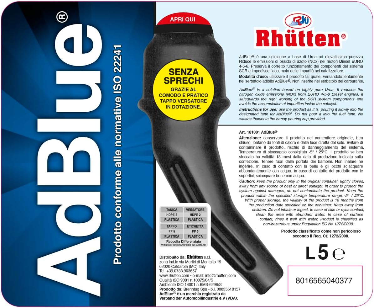 Urea-based solution with very high purity. Reduces nitrogen oxide (NOX) emissions in diesel engines. Converts Nox (main cause of smog) to water vapour and nitrogen (both harmless to the environment). Preserves the proper functioning of the components of the SCR (selective catalytic reduction system) and blocks the accumulation of impurities in the catalyst. The product is mandatory for all Euro 6 diesel cars from 1600cc. If there is no product, the machine will not turn on. The cars are equipped with a special tank, reserved for the AdBlue - the lowering of the level of the AdBlue is indicated with the appropriate AdBlue Rhutten indicator light conforms to ISO 22241 (to avoid the risk of damaging the SCR system, car manufacturers recommend using only Adblue that complies with ISO 22241 standards). How to use: Slowly pour the product into the reservoir. Do not insert into the fuel tank. The package includes the convenient pouring cap that allows you to easily introduce the product into the tank, reducing waste and avoiding contamination of surrounding areas.