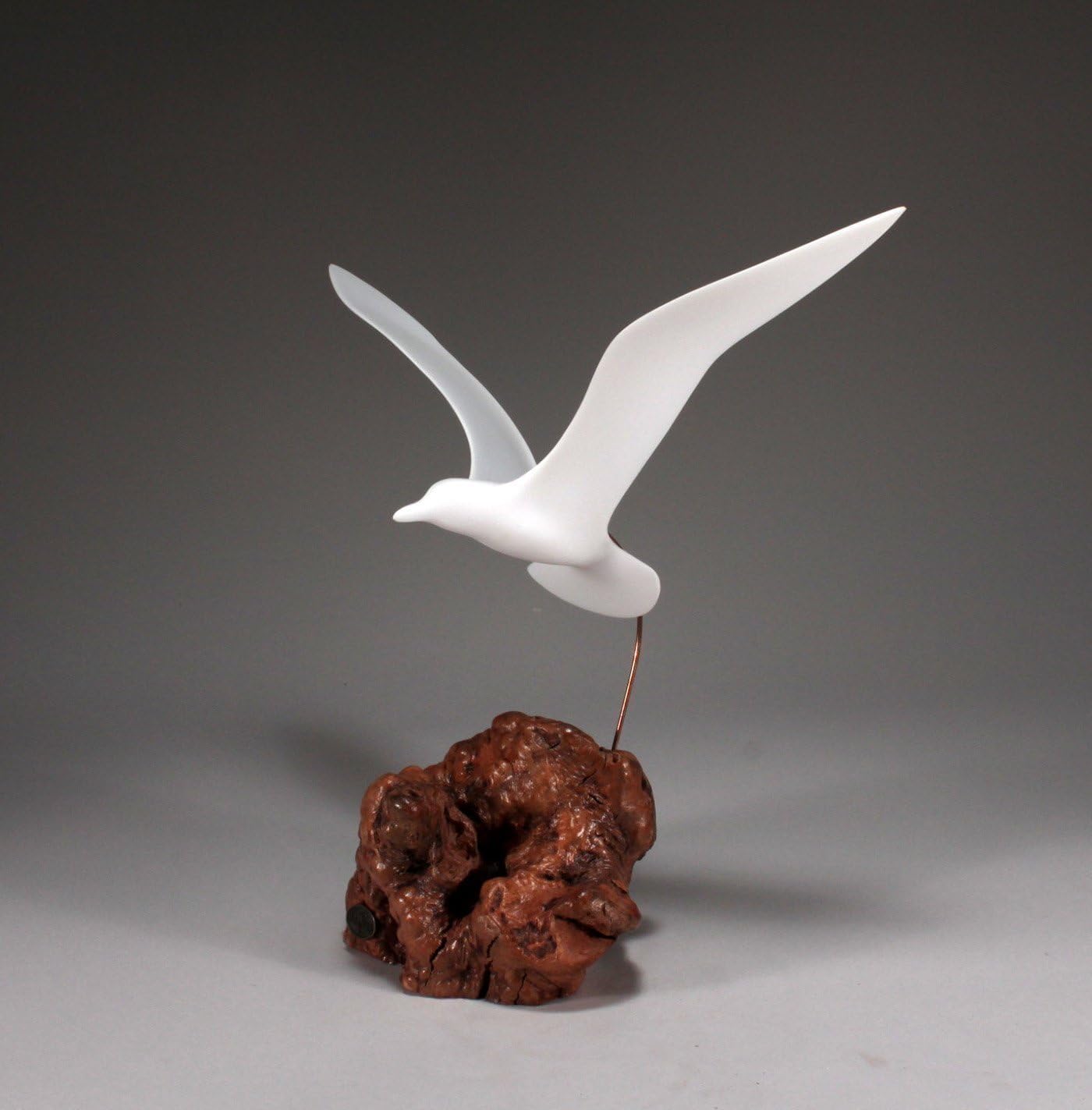 The stylized graceful simplicity of this bird fits the image of the iconic bird in Richard Bach's best selling book Jonathan Livingston Seagull, which helped the Studio get off to a flying startin 1973. More than 50 years later it has become a classic. It is made of, Pellucida, our proprietary compound of resins that resembles but is more durable than Bisque porcelain. This seagull soars above a select polished burlwood base. The gulls wingspan is about 14 inches and the piece stands about 13 inches tall. PLEASE NOTE: the photos are of illustrative samples. Each burl is a unique piece of nature's art, so the one you will receive will be different but of similar size and comparable beauty. It is SIGNED and comes with a CERTIFICATE OF AUTHENTICITY.