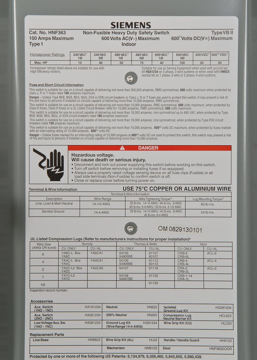 Siemens heavy duty safety switches are available in 30-1200A ratings and in Type 1, 3R, 12 and 4X enclosures. Both fusible and non-fusible versions are offered. They can be used on circuits that are rated through 200K when protected by or used with Class R or J fuses. They feature quick make and break operation and visible blade construction.