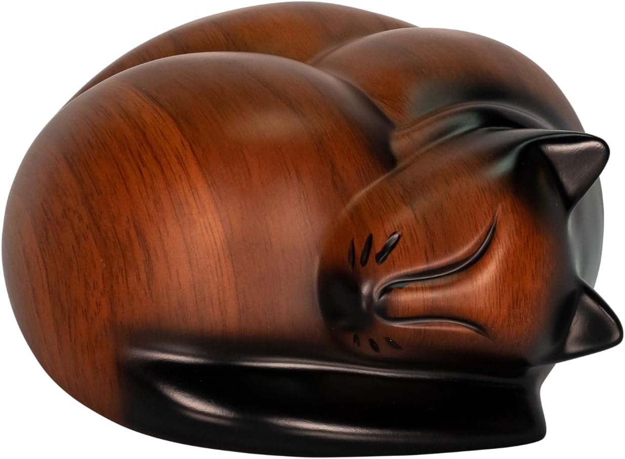 The Sleeping Cat Pet Urn - is carved from resin in the shape of a cat asleep with its eyes closed and tucked in a ball. The cat is carved with lovely details -- such as the nose and whiskers -- that will touch your heart. Overall, this urn for cat ashes is an adorable way to remember your feline friend. Made from resin, the Sleeping Cat Pet Urn is smooth to the touch. The urn is approximately 7 inches long and 3.75 inches high. Any cat lover will cherish this memorial to his/her pet. The urn compartment is accessed from the bottom -- where the bag of pet ashes can be placed inside. The Sleeping Cat Pet Urn - Black has a capacity of 43 cubic inches (will hold the ashes of a cat that weighed 43 pounds or less prior to cremation).