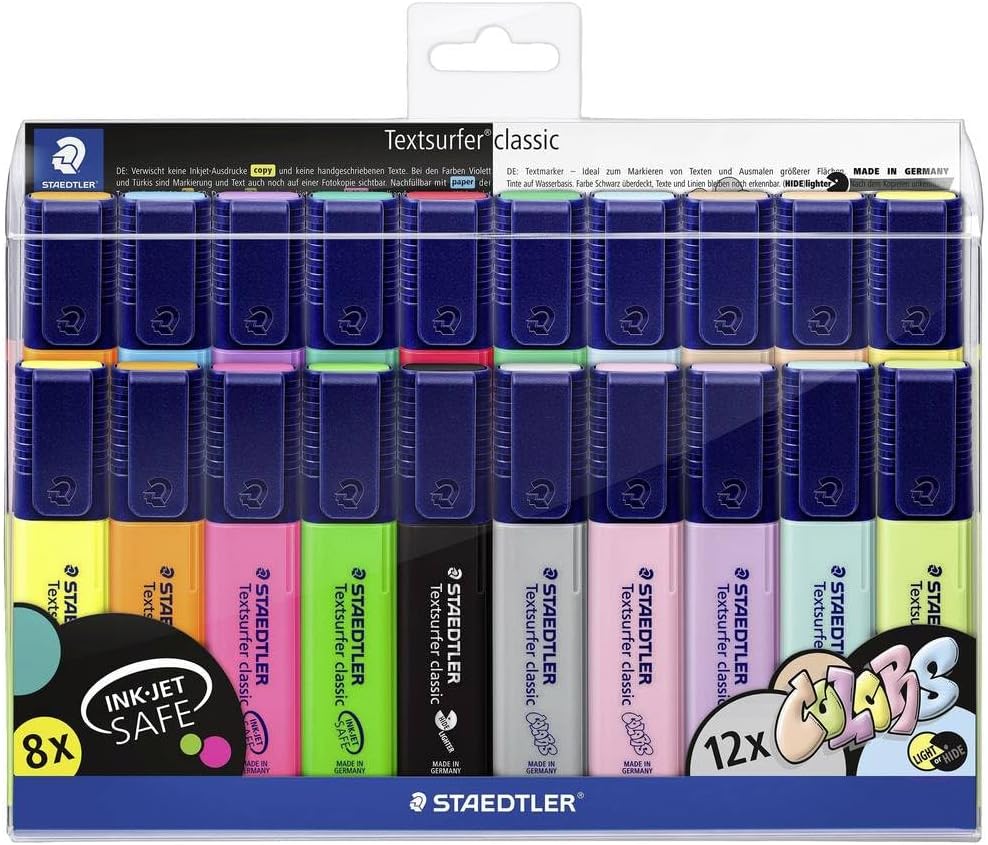 Classic Textsurfer highlighters in a variety of neon, pastel and vintage colours - ideal for highlighting, marking, bullet journaling, diary writing and making study notes. These highlighters offer extra-long highlighting performance and are fast-drying so they're not easily smudged on paper. The ultra-soft chisel tip, approx. 1-5mm, provides excellent ink flow and makes these highlighters easy to use.