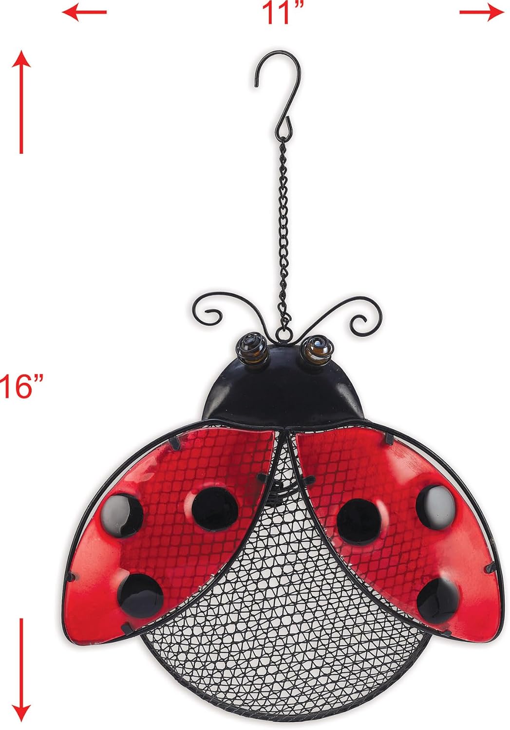 This lovely ladybug does a fabulous job of attracting cardinals, chickadees, finches, grosbeaks, woodpeckers, and more with colored glass wings and black metal face. Feeder measures approximately 11 x 3.5 x 16-inches. The well-ventilated mesh hopper aerates the seed, so it stays fresh, even when it rains. Easy to clean and refill. All-metal construction with powder coated finish. Look for additional items for garden decor bird feeders and houses from Sunset Vista Designs. Sunset Vista Designs has everything under the sunset to decorate with a compelling array of fun and fashionable garden, gift and home decor products.