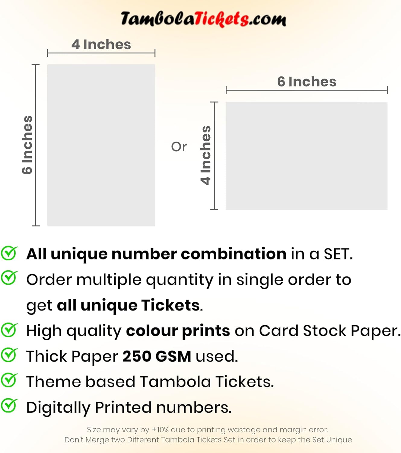 | Included Components | All Unique Cards in Single Order, Big Size Tickets, Order Multiple Quantities for all unique Tickets, Printed on Ink Absorbent Thick Paper, Set of 64 Theme Tambola Tickets Cards |