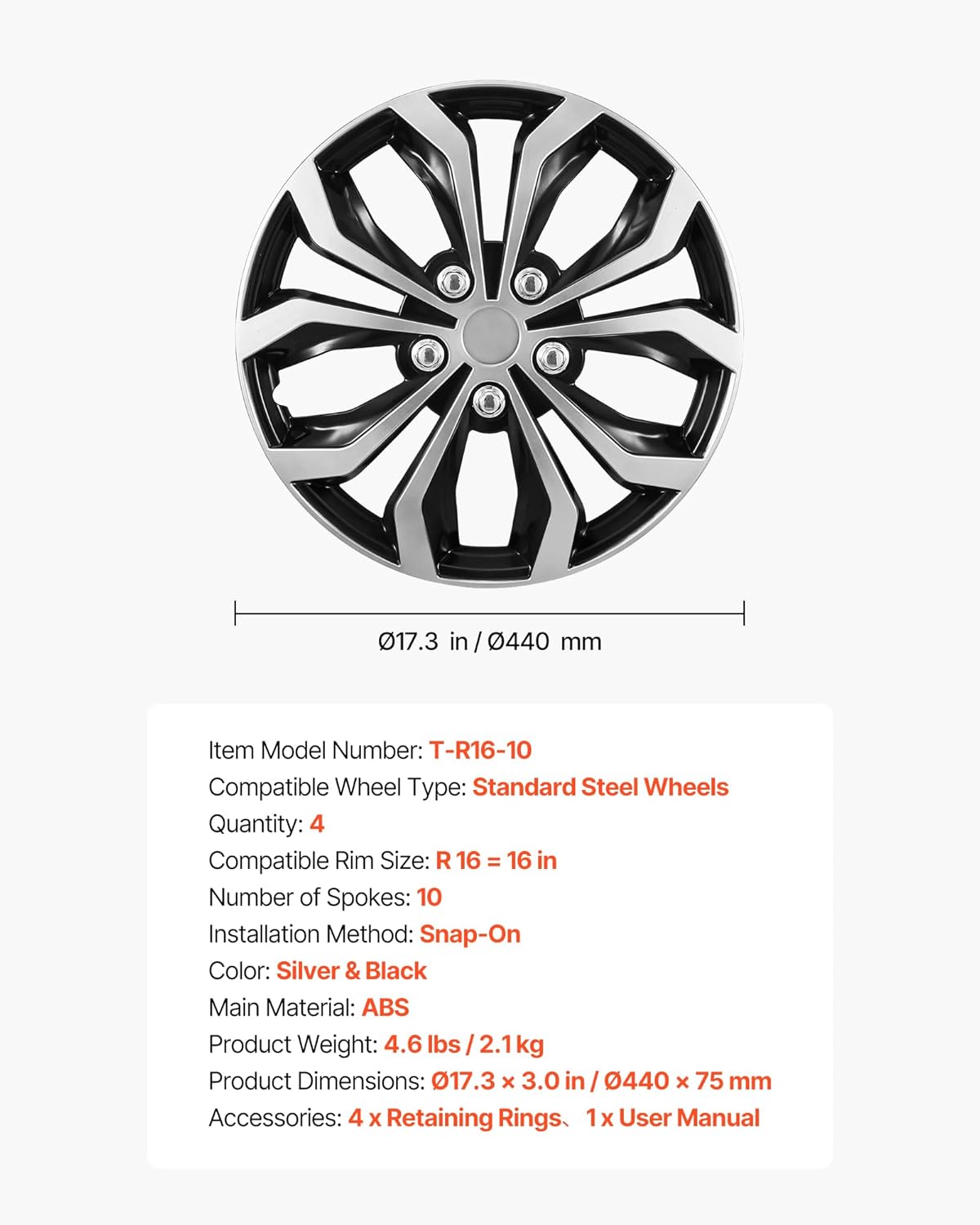 | Item Type Name | 16 Inch Set of 4 Wheel Rim Cover Hubcaps OEM Replacement, R16 Size Snap On Car Hub Caps, Universal 10-Spoke ABS Tire Rim Caps for Hyundai Chevrolet Ford Honda, Silver/Black |