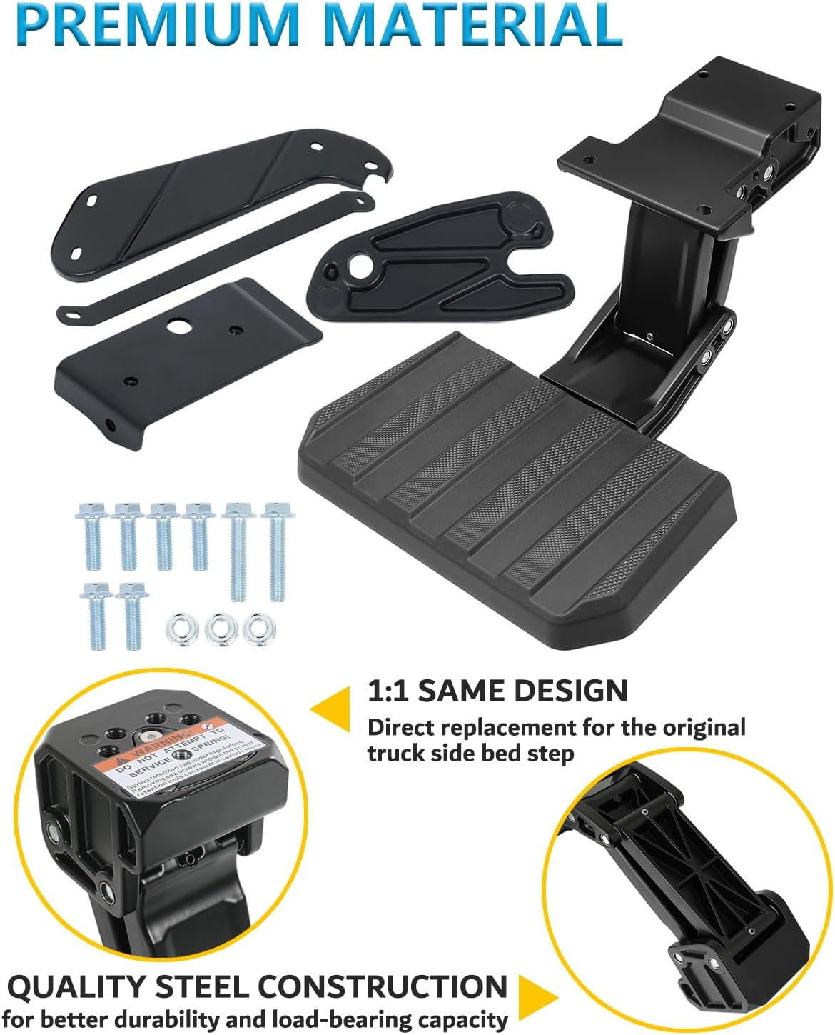 Feature: Provides easy access to pickup truck cab side. Quickly flips down or retracts with just the nudge of your foot. The surface of the pedal is designed with special patterns for good anti-slip effect. for safe footing even in mud, snow or ice. Rated to support 300 lbs. Great value on a quality OEM bumper step. Professional Installation Is Highly Recommended. youtube video had great step by step install instructions. Took 15 minutes to put together and install.