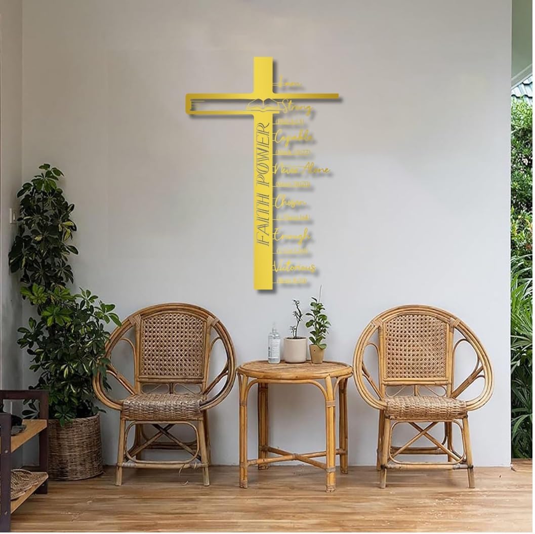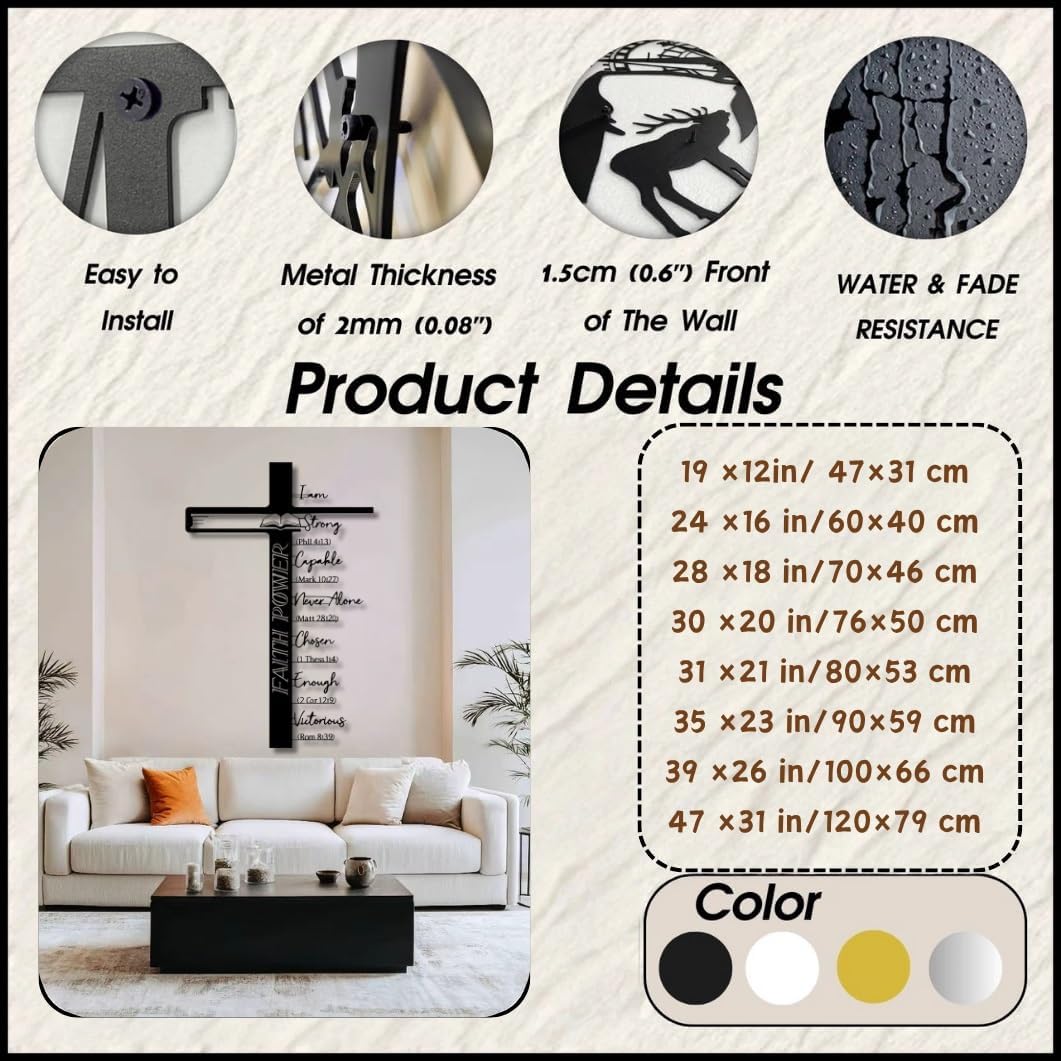 Christian cross metal wall decor, Crosses and Bible Verse Metal Wall Art, Christian Wall Art, Scripture Decorations, Jesus Cross Decor, Phil 4:13, Matt 28:20, Rom 8:39Product FeatureThis Christian cross wall decor is a beautiful of faith and inspiration.. It can be easily hung on the walls of living rooms, bedrooms, study rooms, gardens, corridors, outdoors, garages and other places, adding highlights and topics to the space and highlighting the owner's pursuit of art and beauty.Centered around the iconic cross, it showcases a series of powerful declarations about identity in Christ, each backed by a specific Bible verse.Specifications:Color: Black, White, Gold , Silver.Product thickness: 2 mm / 0. 08" Package Includes:1 x Crosses and Bible Verse Metal Wall Art; 1 x Installation KitNotes:1. Due to manual measurement, dimensions may vary slightly.2. Due to different screen displays, colors may vary slightly.
