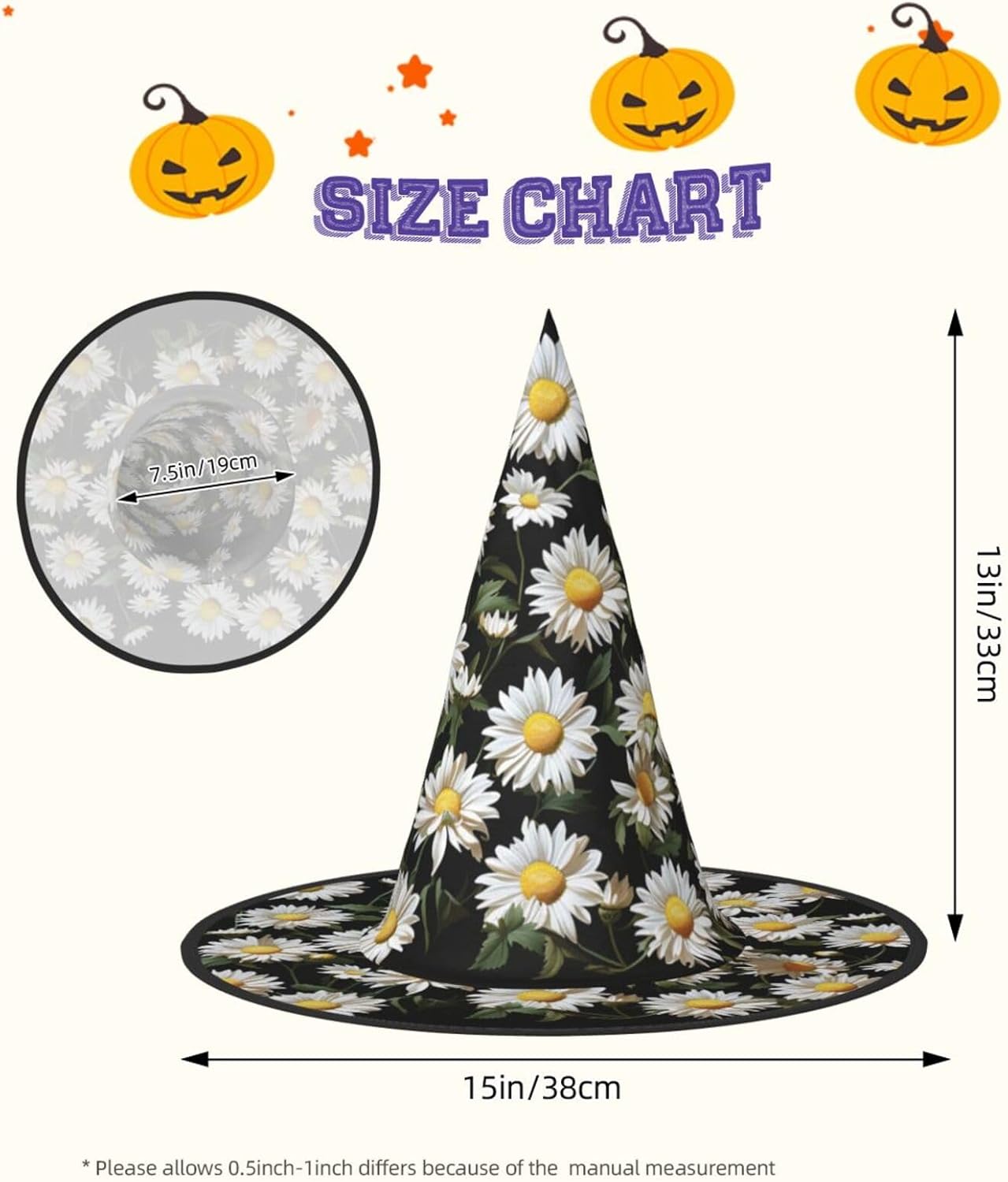 Features:\r\nDaisy Halloween Hanging Witch cap is easy to match your Halloween clothes, costumes, outfits, skirts, creating a strong Halloween atmosphere.\r\nThe Lights String Witch cap can be an ideal gift for your girlfriend, wife, daughters, sisters, mother, neighbors and others, to enjoy a happy Halloween together.\r\n\r\nSpecifications:\r\n\r\nMaterial: oxford cloth\r\nColor: Animal, flower, bird, mountain and forest landscape prints\r\nSize: one size\r\nHeight: about 13 inches/ 33 cm\r\nDiameter: about 15 inches/ 38 cm\r\nQuantity: 1 pieces, 2 pieces\r\n\r\nNotes:\r\nManual measurement, please allow slight errors on size.\r\nThe color may exist a slight difference due to different screen displays.\r\n\r\nVarious styles of printed designs make this colored witch hats stand out. Wearing this beautiful witch hat makes your witch outfit complete and charming, making you an attractive highlight at halloween parties.\r\n\r\nLed string lights witch hat made of high-quality oxford fabric, the fabric is breathable and comfortable, and the lightweight weight makes you feel no burden even if worn for a long time. \r\n\r\nEasy to clean: Dog witch hats can machine wash or hand wash. The fabric of the hat is easy to dry, easy to care for, and. It is recommended not to use bleach.