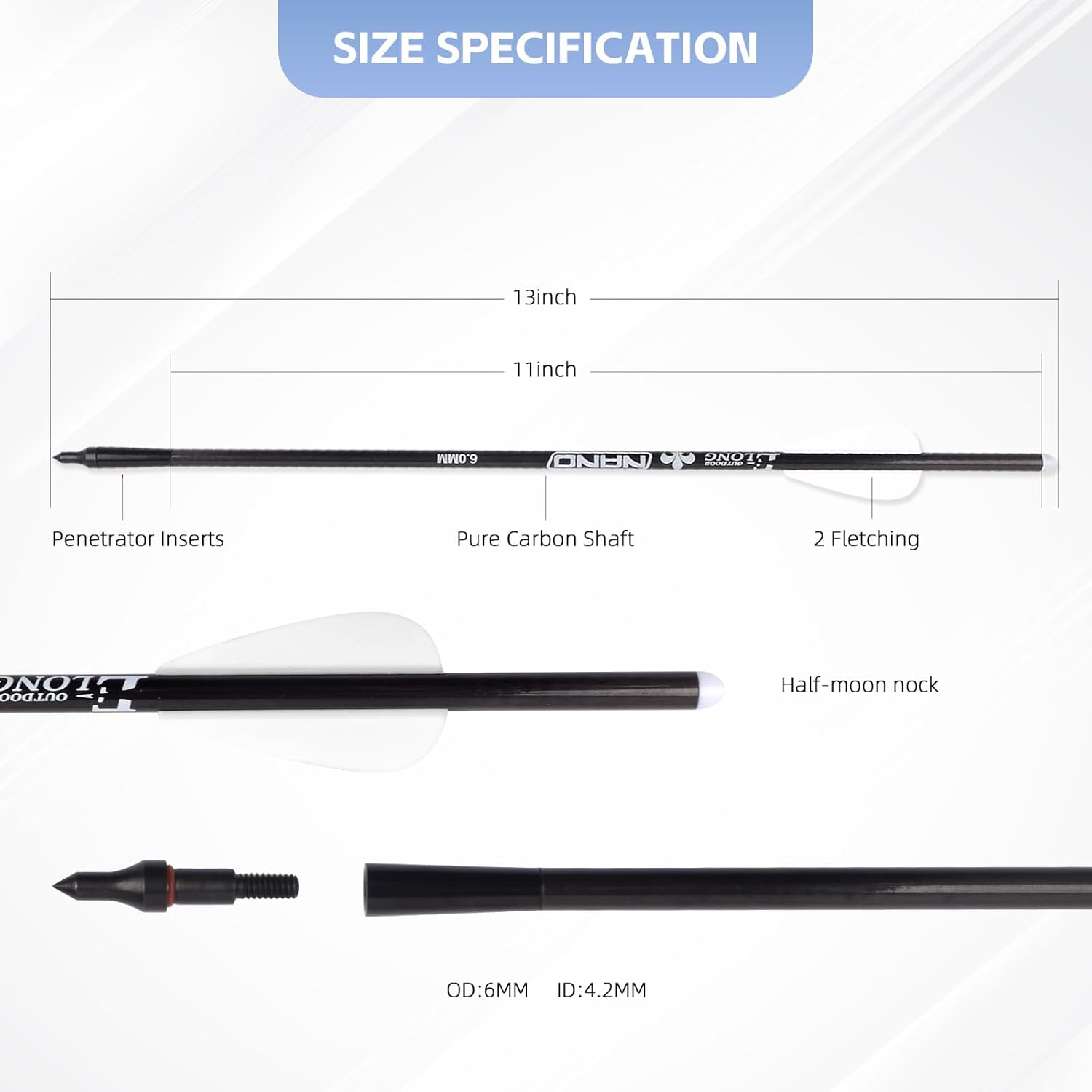 Shaft OD 6.0mm/0.236″, ID 4.2mm/0.166″.Compatible with standard tips and broadheads.For hunting and practice. Bolt Weight Adjustment. Weight with aluminum penetrator insert 250 grains.Half-Moon nock. Aluminum penetrator insert. Steel field tip.