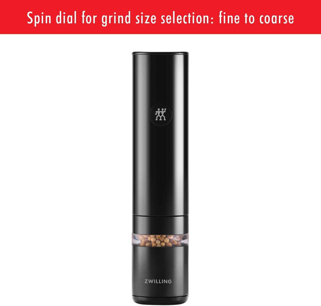 This quiet, compact salt, pepper, and spice mill boasts a powerful and durable ceramic grinder that creates consistent-sized grinds quickly and efficiently. Featuring an easy-to-use spin dial for choosing grind size from fine to coarse, and an automatic light that illuminates the area over which you are grinding, the sleek-looking mill is both elegant and highly functional. To fill the mill, simply twist the base to the unlock position, separate, and load the spices of your choosing. The 360° window lets you see what has been loaded and gauge when it is time to refill. Recharge the device with the included USB cable. ZWILLING Enfinigy is the revolutionary electrics line that mixes German engineering and innovation with a fresh, sleek design. This gorgeous line combines modern aesthetics with high-performance features and the longest warranties in the industry.